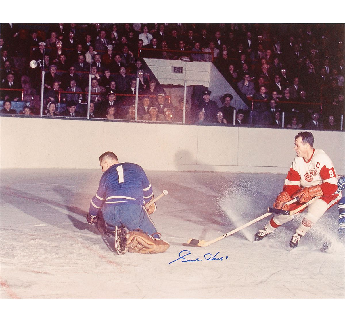 Color satin-finish 20 x 16 photo of Howe scoring a goal, signed in blue felt tip. In fine condition.