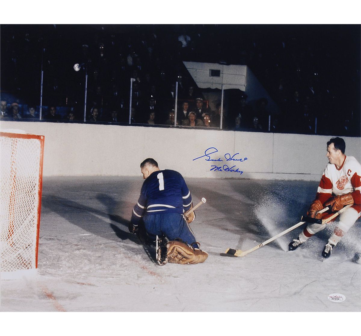 Color satin-finish 20 x 16 photo of Howe on the ice, signed in blue felt tip, “Gordie Howe, Mr. Hockey.” In fine condition, with a JSA label affixed to the lower right corner. Accompanied by a certificate of authenticity from JSA.