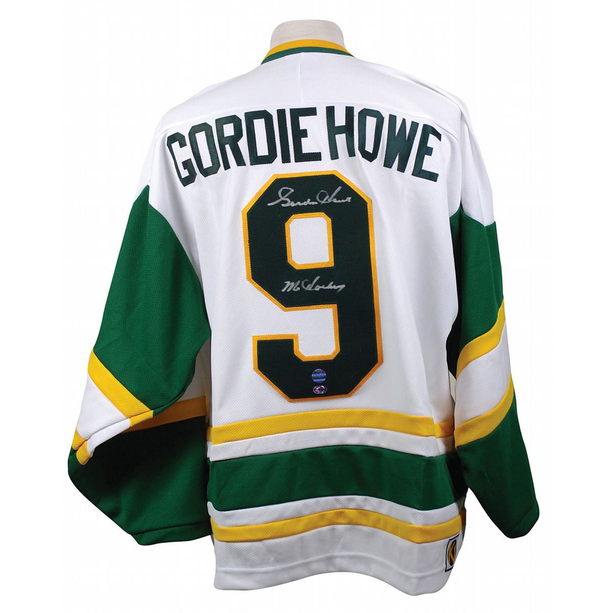 Official K1 replica New England Whalers hockey jersey, with sewn on letters and numbers, signed in silver ink on the number on the back, “Gordie Howe, Mr. Hockey.” In fine condition.