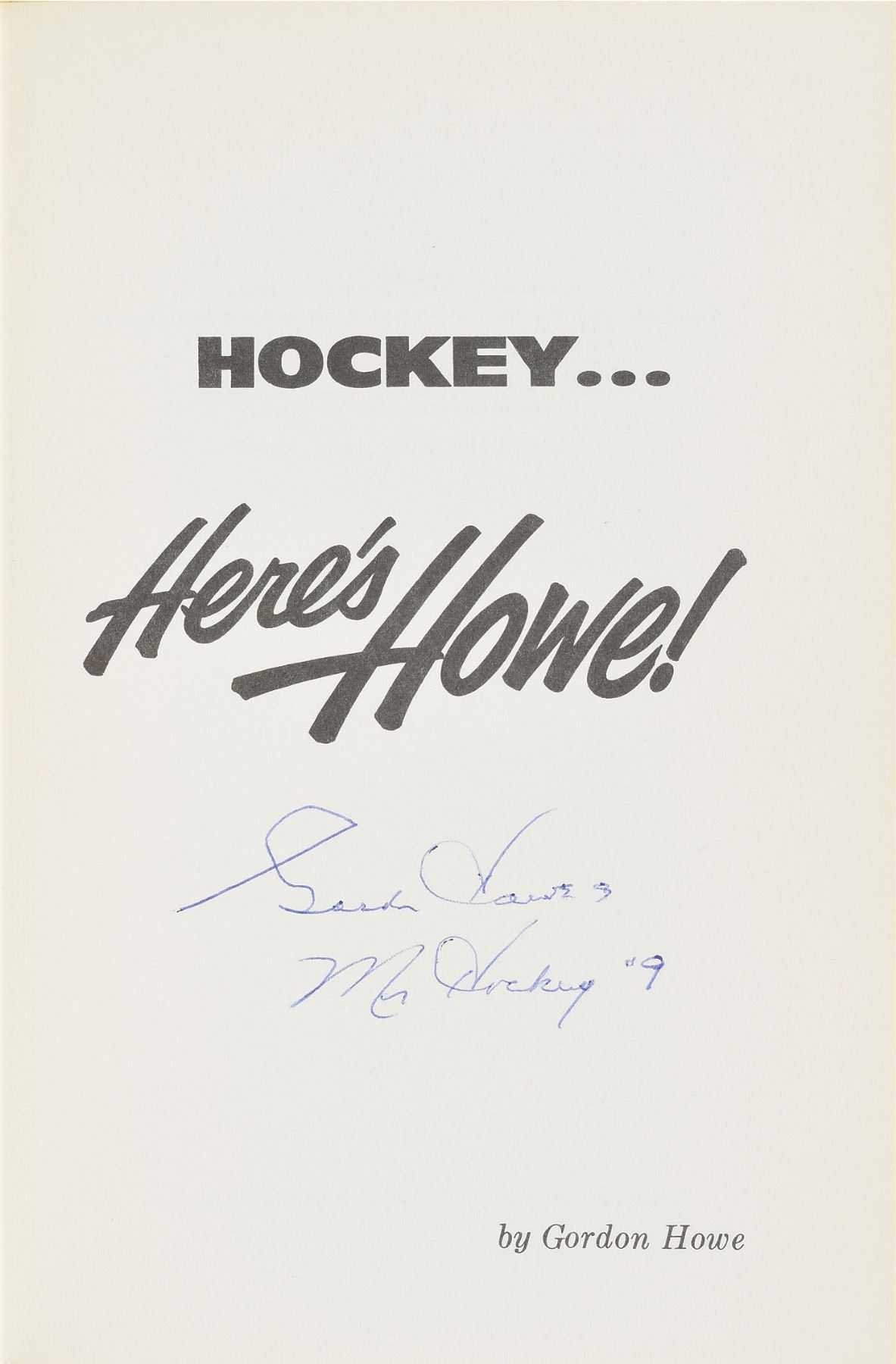 Signed book: Hockey…Here's Howe!. First edition. Canada: The Copp Clark Publishing Company, 1963. Hardcover, 5.75 x 8.75, 91 pages. Signed on the title page in blue ballpoint, "Gordie Howe, Mr. Hockey, #9." In fine condition.