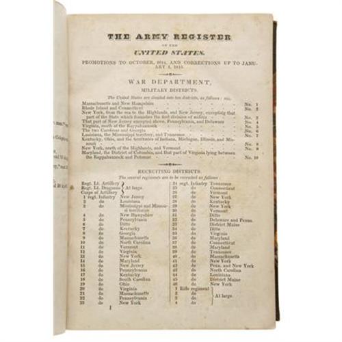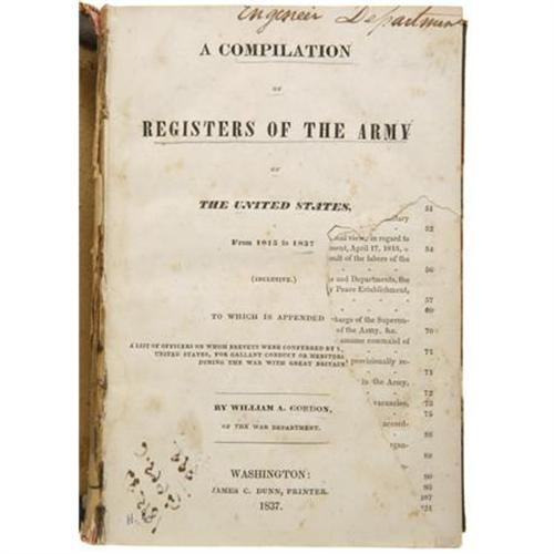 <B>William A. Gordon, <I>A Compilation of Registers of the Army of the United States from 1815 to 1837,</B></I></B></I> (Washington: James C. Dunn, 1837), 601 pages, 5 page appendix, 12mo (5 x 7.5), ex-library copy with several stamps, torn title page, loose covers, weak binding, taped spine, toned pages, fair. <BR><BR><b>Shipping:</b> Books & Catalogs (<a target="_blank" href="http://www.heritageauctions.com/common/shipping.php">view shipping information</a>)