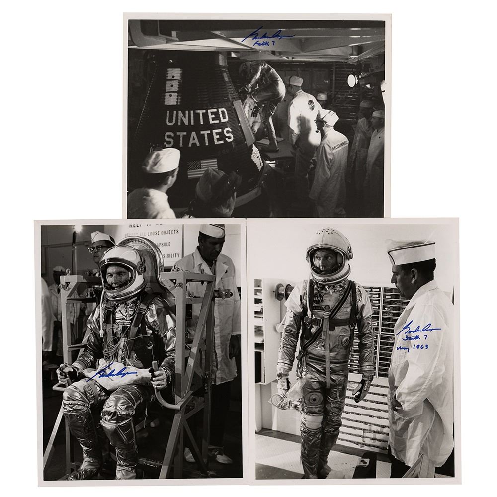 Three official glossy NASA photos, 8 x 10 and 10 x 8, each signed in blue felt tip by the pictured astronaut, Gordon Cooper, who adds "Faith 7, May 1963" and "Faith 7" below two of the autographs. Reverse of each bears NASA caption text. In overall fine condition, with some scattered light creasing.