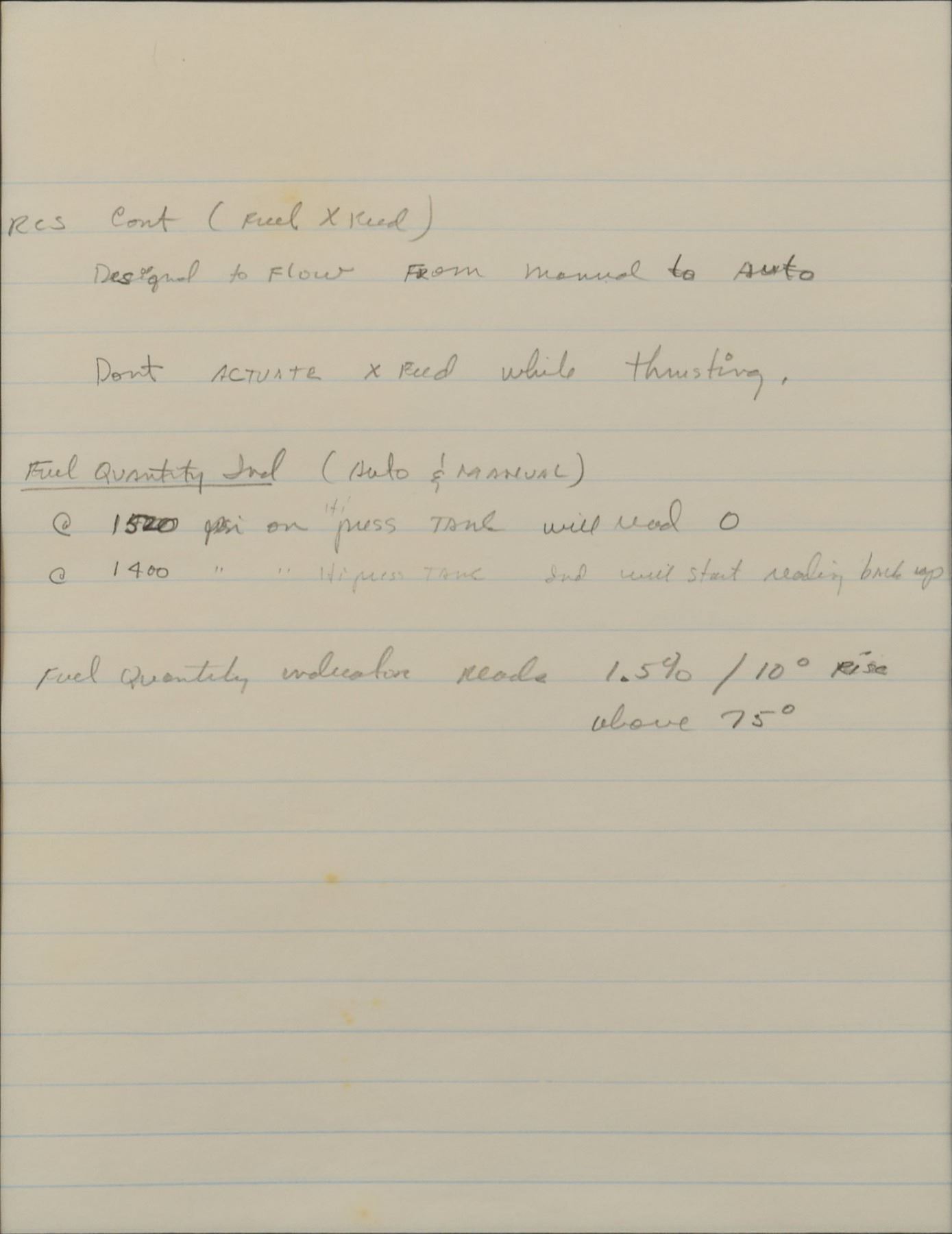Desirable pairing of Gordon Cooper items: one page of Cooper's handwritten notes in pencil related to his spacecraft's Reaction Control System, taken in preparation for his historic MA-9 flight aboard the Faith 7 in 1963, 7.25 x 9.25, in part: "RCS Cont (Fuel x Feed), Designed to flow from manual to auto. Don't actuate x feed while thrusting," with further notes on fuel and PSI; and a color satin-finish 7.25 x 9.25 photo of Cooper in his silver Mercury space suit, signed in blue felt tip, "Gordon Cooper, Faith 7." Nicely double-matted and framed side-by-side to an overall size of 24 x 16.5. In fine condition. Accompanied by a photocopy of a letter of authenticity from Zarelli Space Authentication for the handwritten notes, which were once part of a four-page lot. On Mercury Atlas-9, launched on May 15, 1963, Cooper completed 22 Earth orbits before landing in the Pacific Ocean—the last American to complete a solo orbital mission.