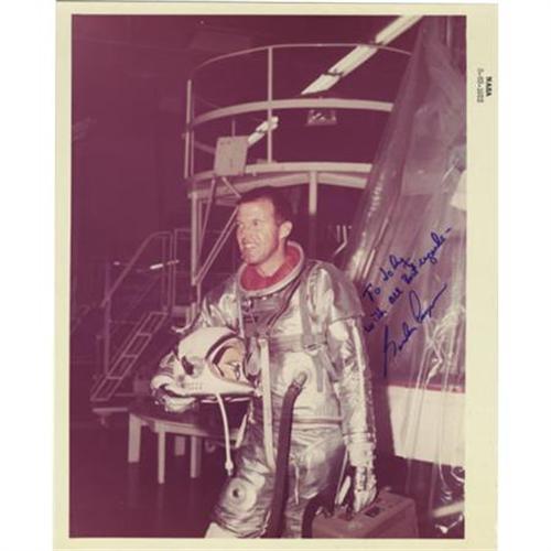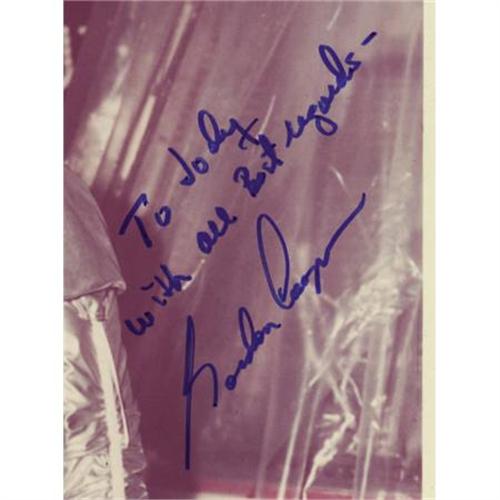 <B>Gordon Cooper Signed Color Photograph,</B></I> 8" x 10", "<I>To Jody/ with all best regards/ Gordon Cooper.</B></I>" Cooper, who died in 2004, stands fully suited beside his Faith 7 Mercury spacecraft during preflight testing in this photograph taken on May 1, 1963, two weeks before the launch. <I>From the collection of renowned former physical trainer of the astronauts Joe Garino. This lot is accompanied by a signed certificate of authentication from Garino verifying its provenance.</B></I><BR><BR><b>Shipping:</b> Flat Material, Small (<a target="_blank" href="http://www.heritageauctions.com/common/shipping.php">view shipping information</a>)