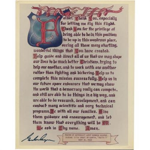 <B>Gordon Cooper Signed Color Photograph: His Prayer From Space,</B></I> 8" x 10", "<I>Gordon Cooper</B></I>". Captioned: "<I>Prayer of Astronaut Leroy Gordon Cooper/ During 17th Orbit of Earth, 'Faith 7'/ May 16, 1963.</B></I>" Cooper died in 2004. <I>From the collection of renowned former physical trainer of the astronauts Joe Garino. This lot is accompanied by a signed certificate of authentication from Garino verifying its provenance.</B></I><BR><BR><b>Shipping:</b> Flat Material, Small (<a target="_blank" href="http://www.heritageauctions.com/common/shipping.php">view shipping information</a>)