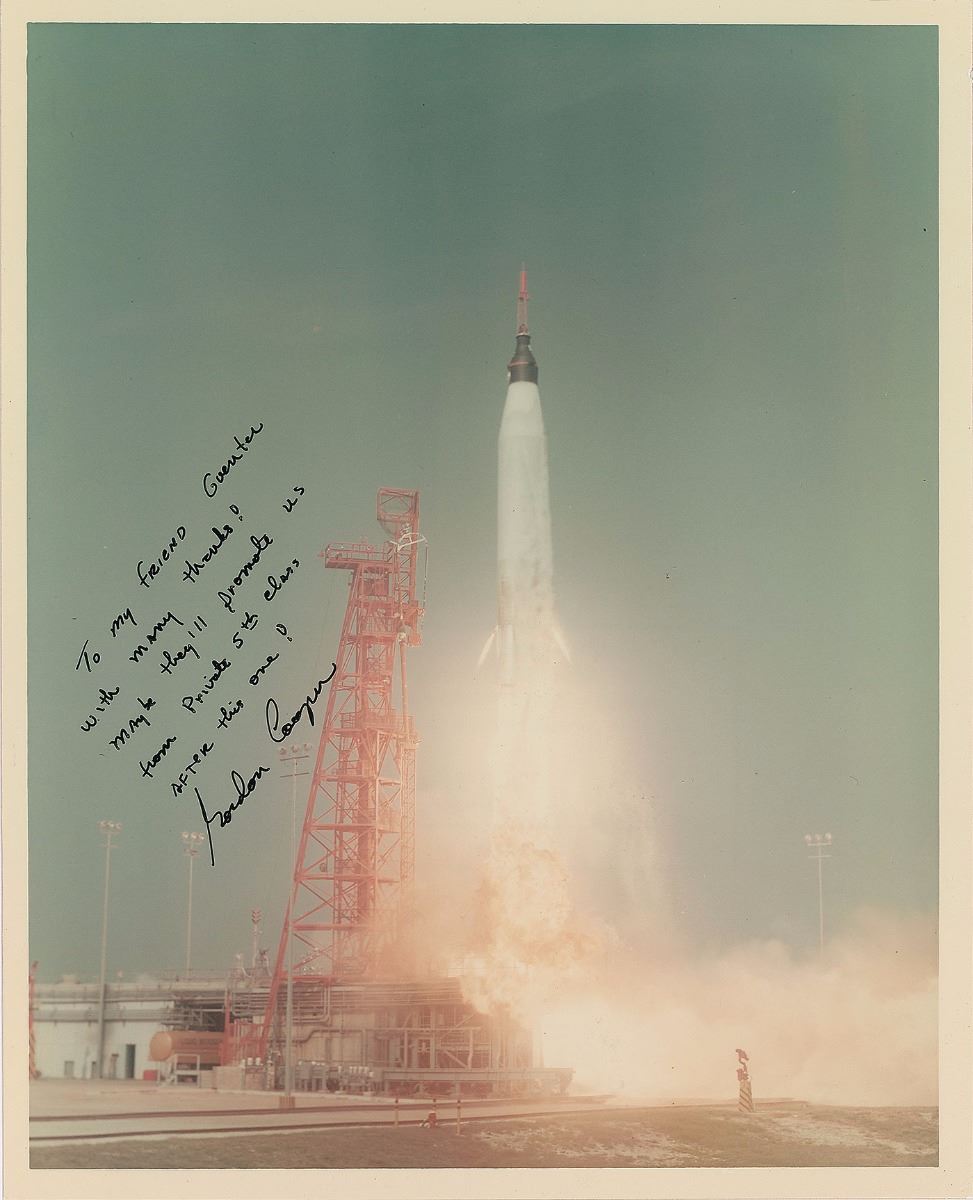 Official color glossy 8 x 10 NASA photo of the Mercury-Atlas 9 launch, signed and inscribed in black ink, “To my friend Guenter, with many thanks! Maybe they’ll promote us from Private 5th class after this one! Gordon Cooper.” Also signed on the reverse by Wendt and stamped as being from his personal collection. In fine condition. The Guenter Wendt Collection, ex. Ken Havekotte.