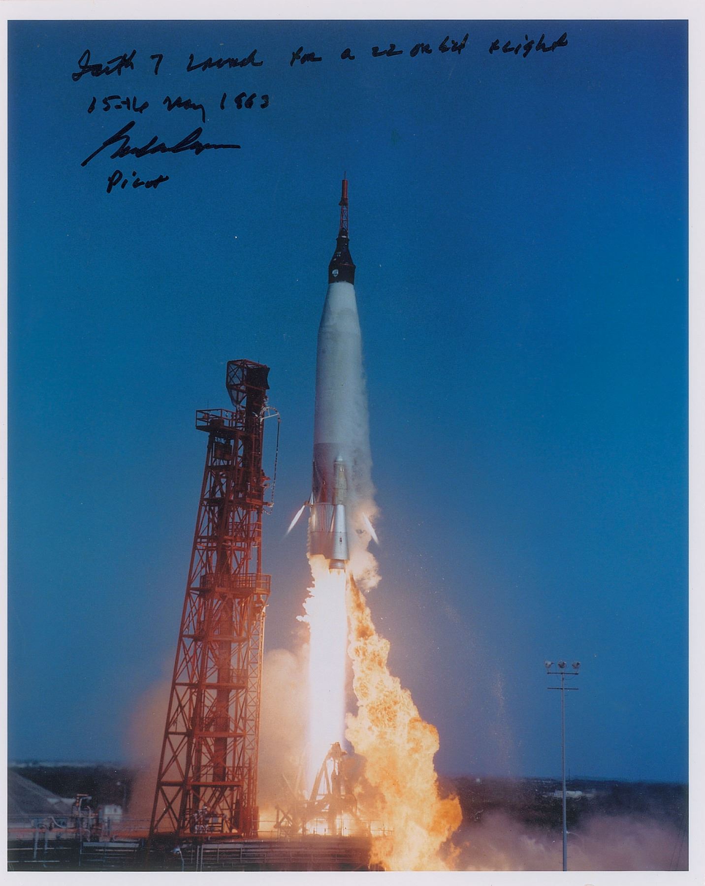 Color satin-finish 8 x 10 photo of the Mercury-Atlas 9 liftoff, signed in black felt tip, "Faith 7 launch for a 22 orbit flight, 15–16 May 1963, Gordon Cooper, Pilot." In fine condition, with a few small edge creases.