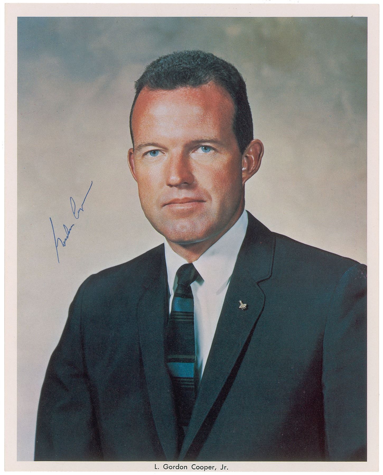 Official color 8 x 10 NASA lithograph of Gordon Cooper in a formal head-and-shoulders pose, with an astronaut pin visible on his lapel, signed in black ink. In very fine condition.