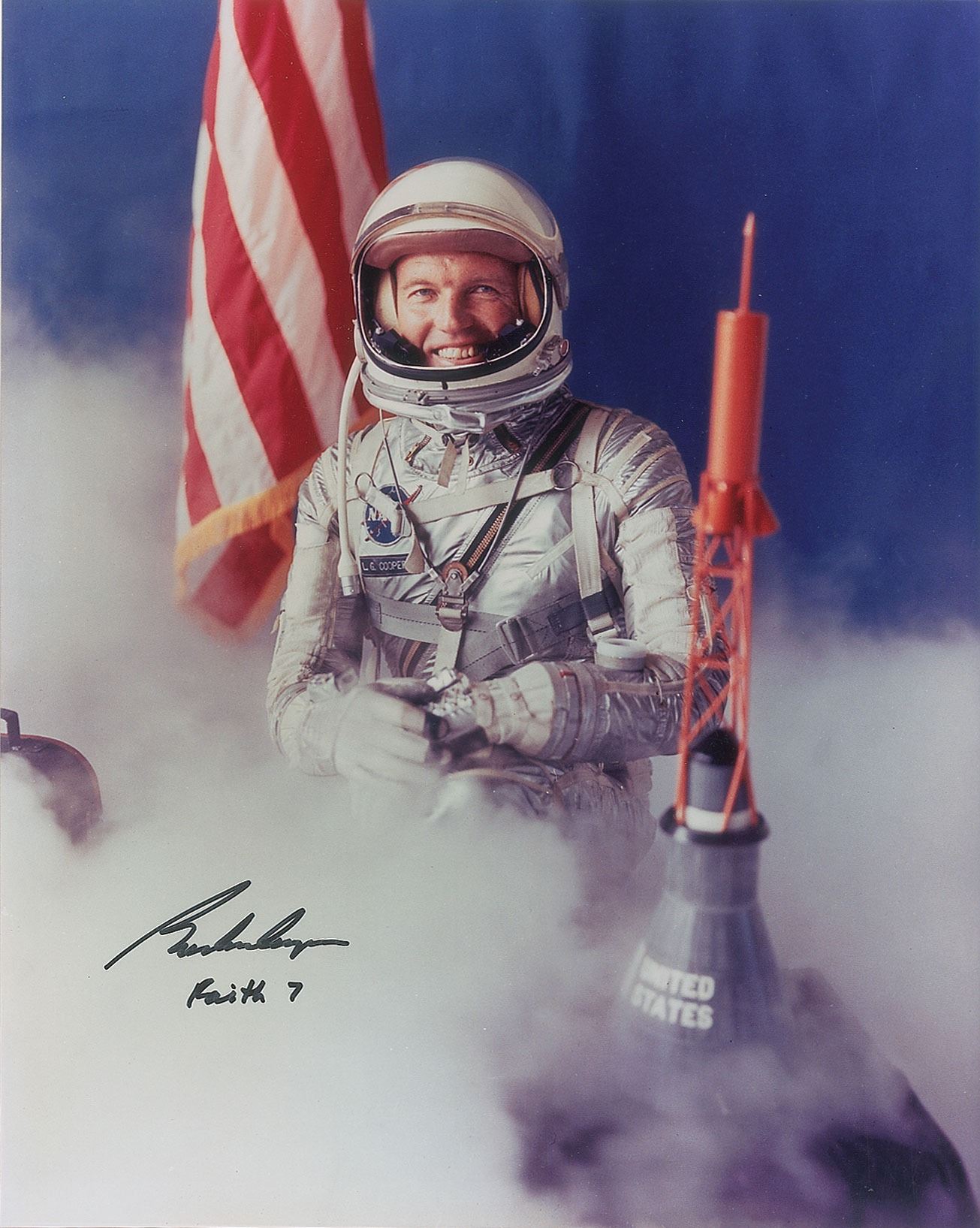Fantastic color semi-glossy 8 x 10 photo of Cooper wearing his Mercury space suit next to a capsule model and surrounded by mist, signed in black felt tip, "Gordon Cooper, Faith 7." In very fine condition.