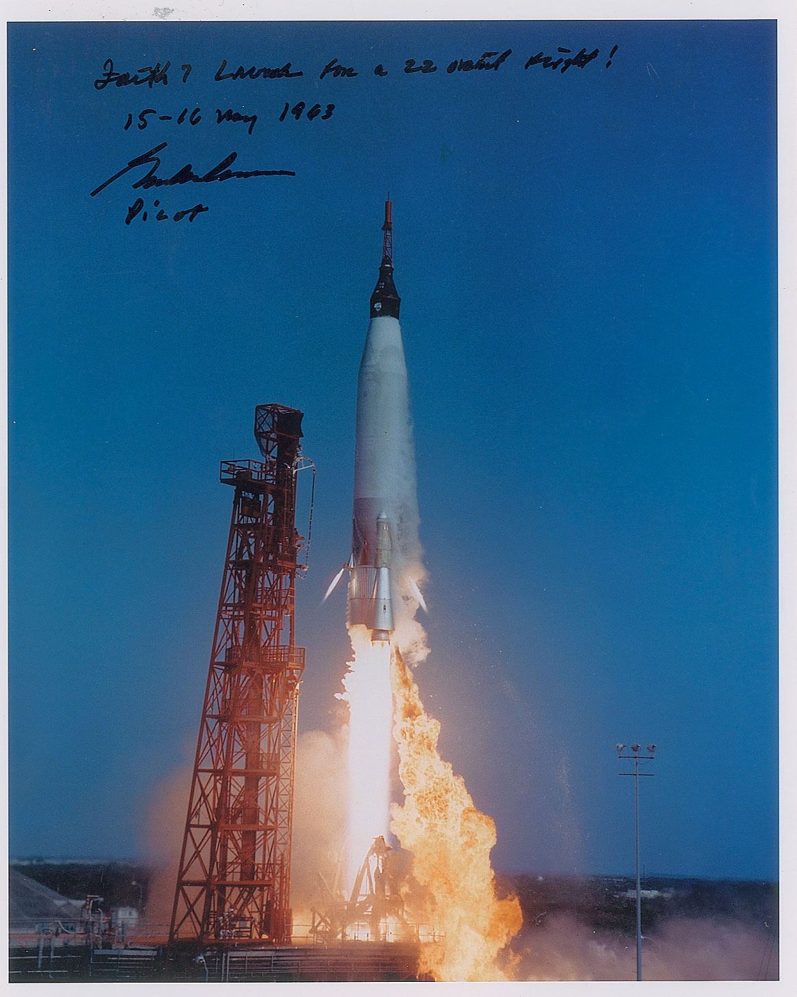 Attractive color satin-finish 8 x 10 photo of the fiery Mercury-Atlas 9 liftoff, signed in black felt tip, "Faith 7 launch for a 22 orbit flight, 15–16 May 1963, Gordon Cooper, Pilot." In fine condition, with a few small edge creases.