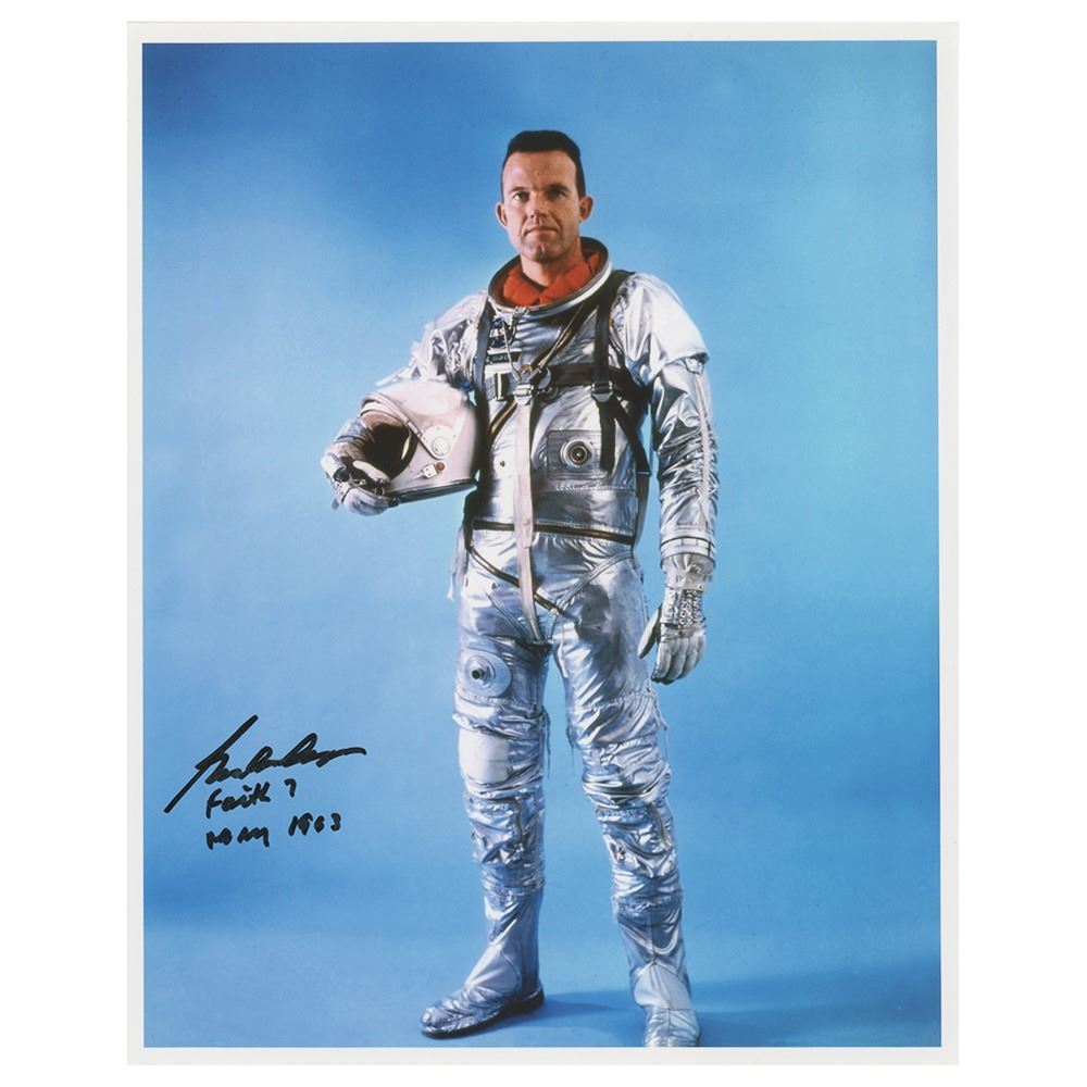 Color satin-finish 8 x 10 photo of Cooper in his Mercury space suit, signed in black felt tip, "Gordon Cooper, Faith 7, May 1963." In very fine condition.