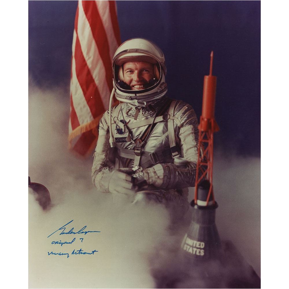 Color semi-glossy 8 x 10 photo of Cooper wearing his Mercury space suit next to a capsule model and surrounded by mist, signed in thin blue felt tip, "Gordon Cooper, Original 7, Mercury Astronaut." In very fine condition.