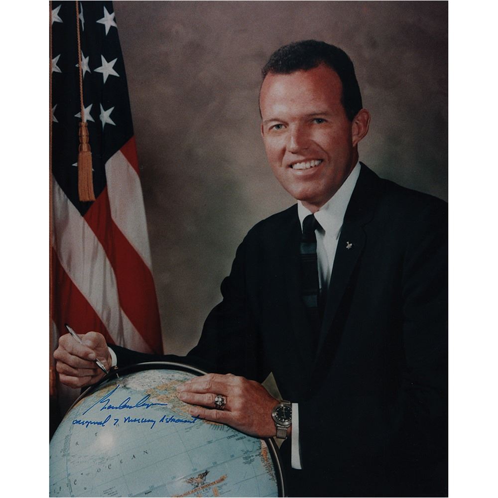 Color satin-finish 8 x 10 photo of Gordon Cooper in a formal pose‰ÛÓhis lapel bearing an astronaut pin‰ÛÓresting his hands on a globe of the Earth, with Cooper's blue felt tip signature placed cleverly below a pen in his right hand: "Gordon Cooper, Original 7 Mercury Astronaut." In fine condition, with a tiny ding to the top edge.