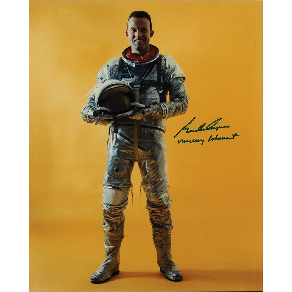 Color satin-finish 8 x 10 full-length photo of Cooper posing in his Mercury space suit against a yellow backdrop, signed in black felt tip, "Gordon Cooper, Mercury Astronaut." In very fine condition.