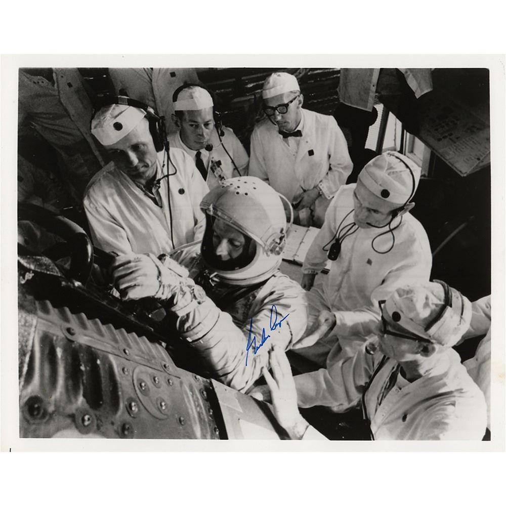 Glossy 10 x 8 photo of Gordon Cooper entering the Mercury capsule, neatly signed in blue felt tip. In fine condition.
