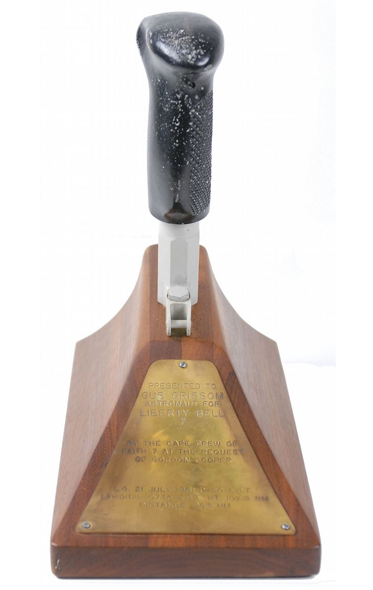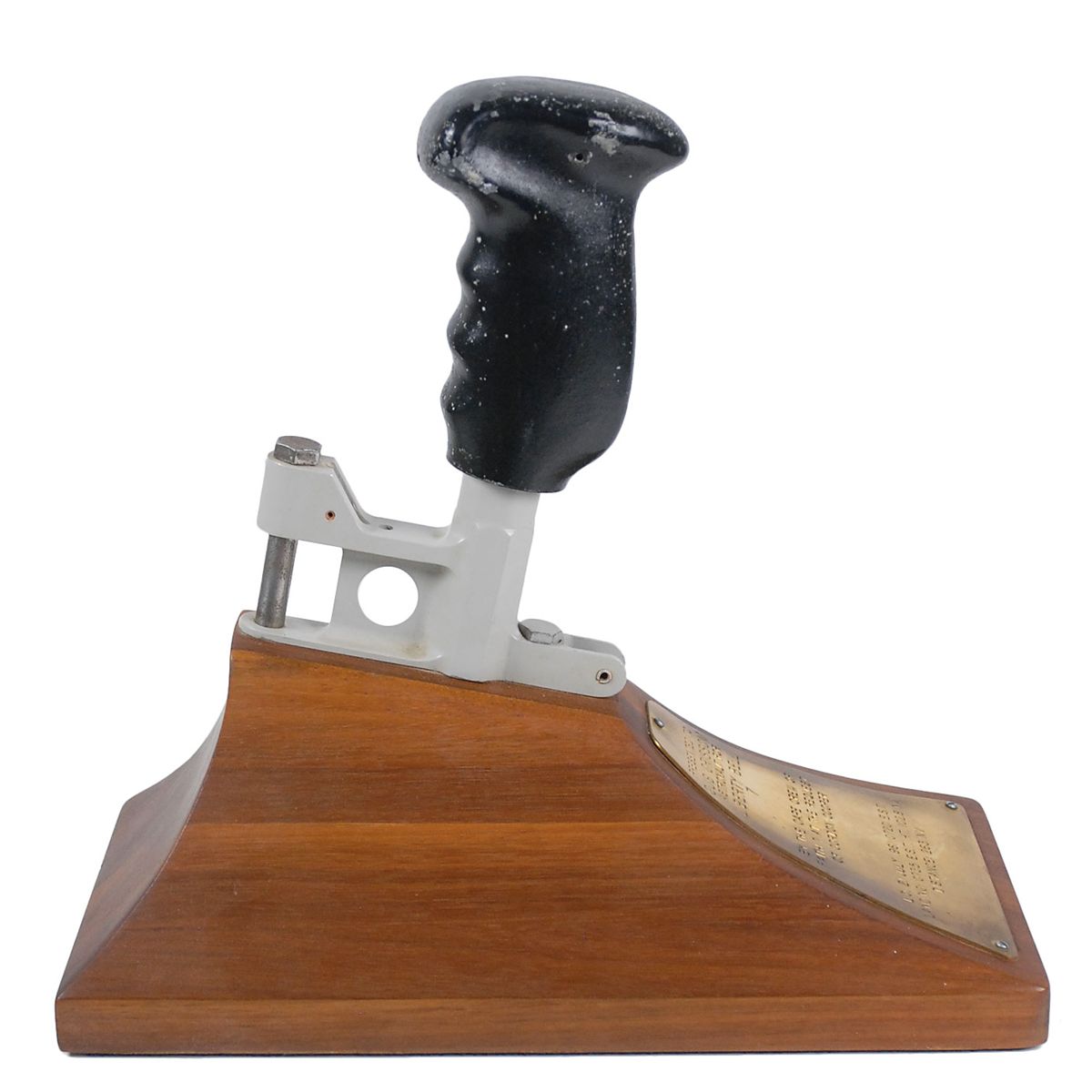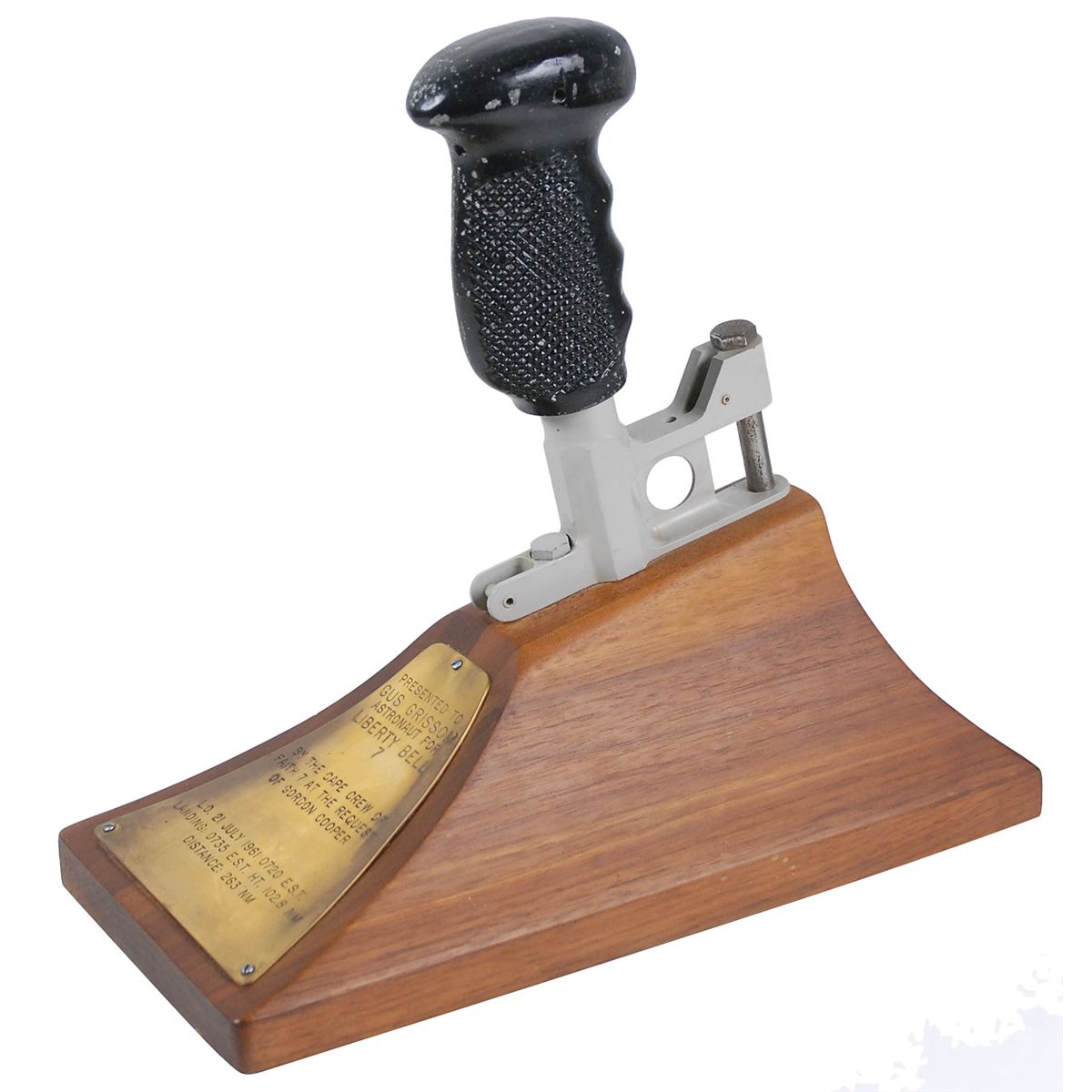 Mercury-era hand controller presented to fellow Mercury astronaut Gus Grissom. Right-handed controller measures 5 x 7.25 and has been mounted on to a 6 x 12 x 5 wooden base. Front of the base bears an engraved brass plaque which reads: “Presented to Gus Grissom, Astronaut for Liberty Bell 7, by the Cape crew of Faith 7 at the request of Gordon Cooper. L. O. 21 July 1961 0720 E.S.T.; Landing: 0735 E.S.T. Ht. 102.8 NM; Distance: 263 NM.” In fine condition, with expected wear and scuffing of black paint on handle and some mild tarnishing to plaque.