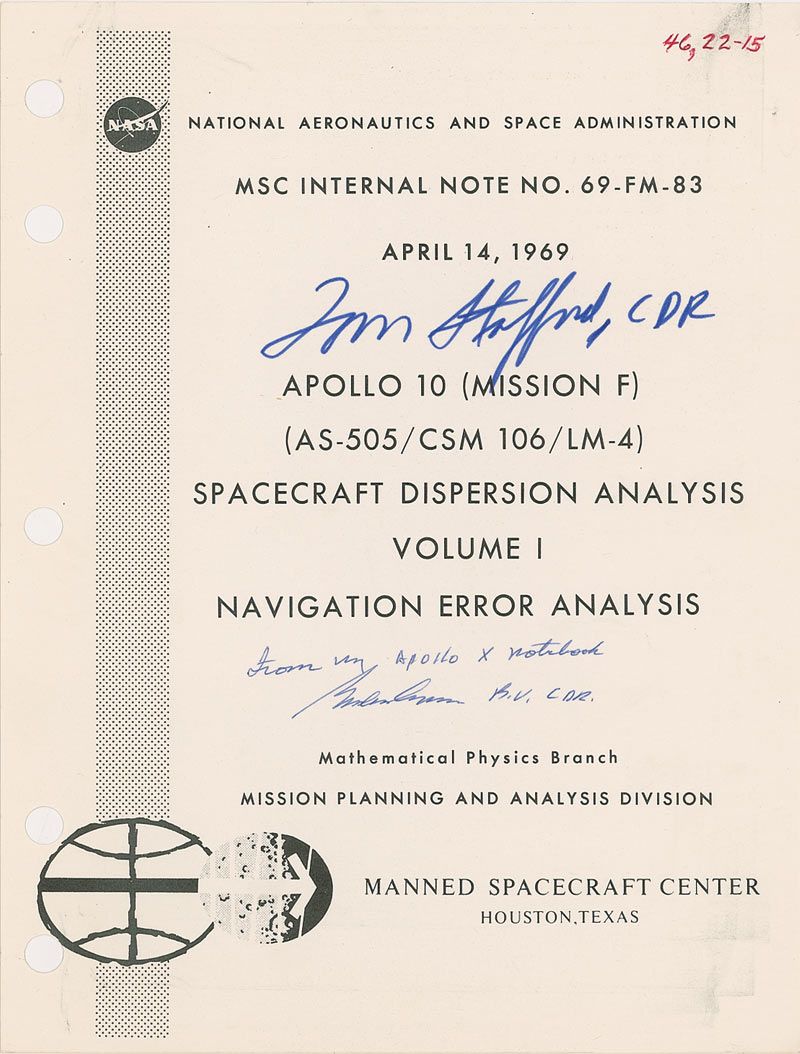 Gordon Cooper’s personal Apollo 10 Spacecraft Dispersion Analysis Manual, 8 x 10.5, 35 unbound pages, signed on the front cover in blue ballpoint, “From my Apollo X notebook, Gordon Cooper B.U. CDR.,” and in blue felt tip, “Tom Stafford, CDR.” In fine condition, with small ink notation to top right of cover as well as a bit of light soiling.