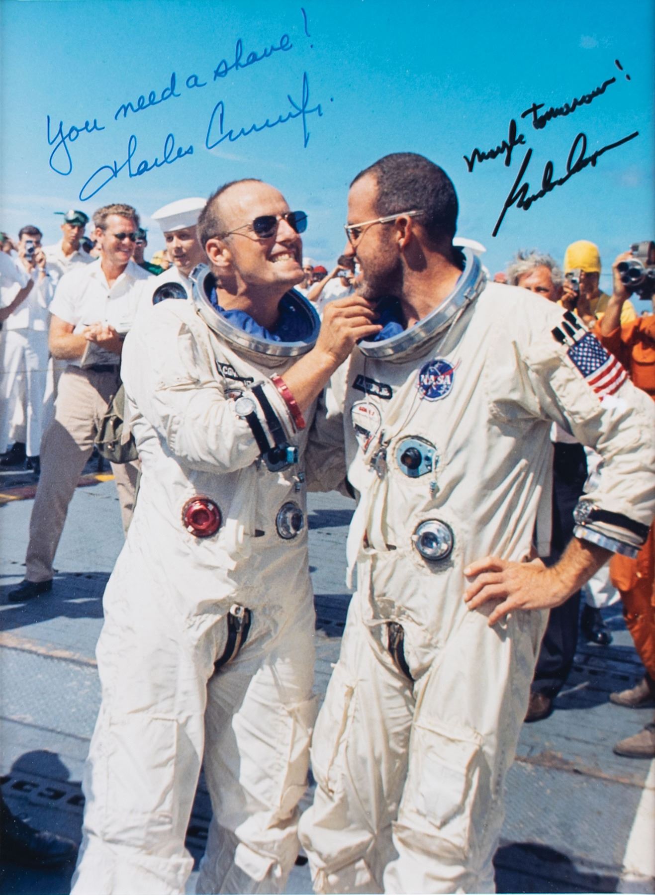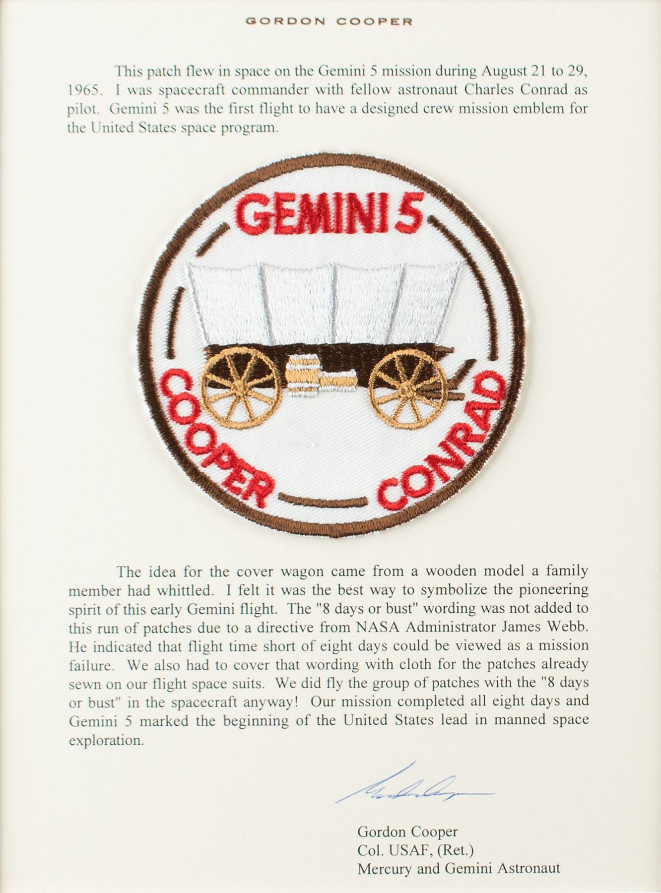 Fantastic large flown embroidered Gemini 5 mission patch, 4˝ in diameter, affixed to a letter of provenance signed in blue ballpoint by Command Pilot Gordon Cooper, in part: "This patch flew in space on the Gemini 5 mission during August 21 to 29, 1965…Gemini 5 was the first flight to have a designed crew mission emblem for the United States space program. The idea for the cover wagon came from a wooden model a family member had whittled. I felt it was the best way to symbolize the pioneering spirit of this early Gemini flight. The '8 days or bust' wording was not added to this run of patches due to a directive from NASA Administrator James Webb. He indicated that flight time short of eight days could be viewed as a mission failure…Our mission completed all eight days and Gemini 5 marked the beginning of the United States lead in manned space exploration." The patch and letter are matted alongside a color satin-finish 7 x 9.5 photo of the GT-5 crew after recovery, signed in blue felt tip, "You need a shave! Charles Conrad, Jr.," and in black felt tip, "Maybe tomorrow! Gordon Cooper." The display measures an overall 19 x 12.5. In fine condition. A historic flown piece representing America's pioneering position in the history of manned spaceflight.