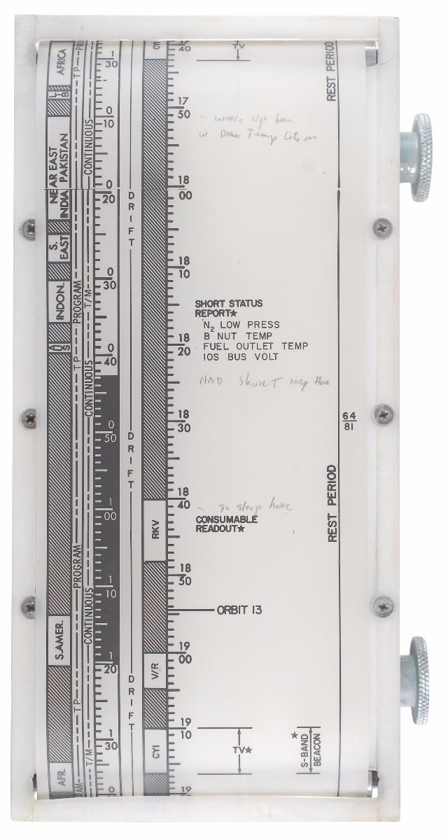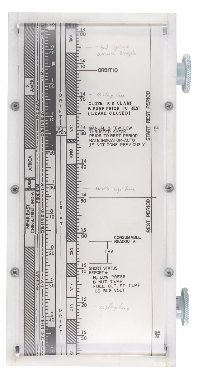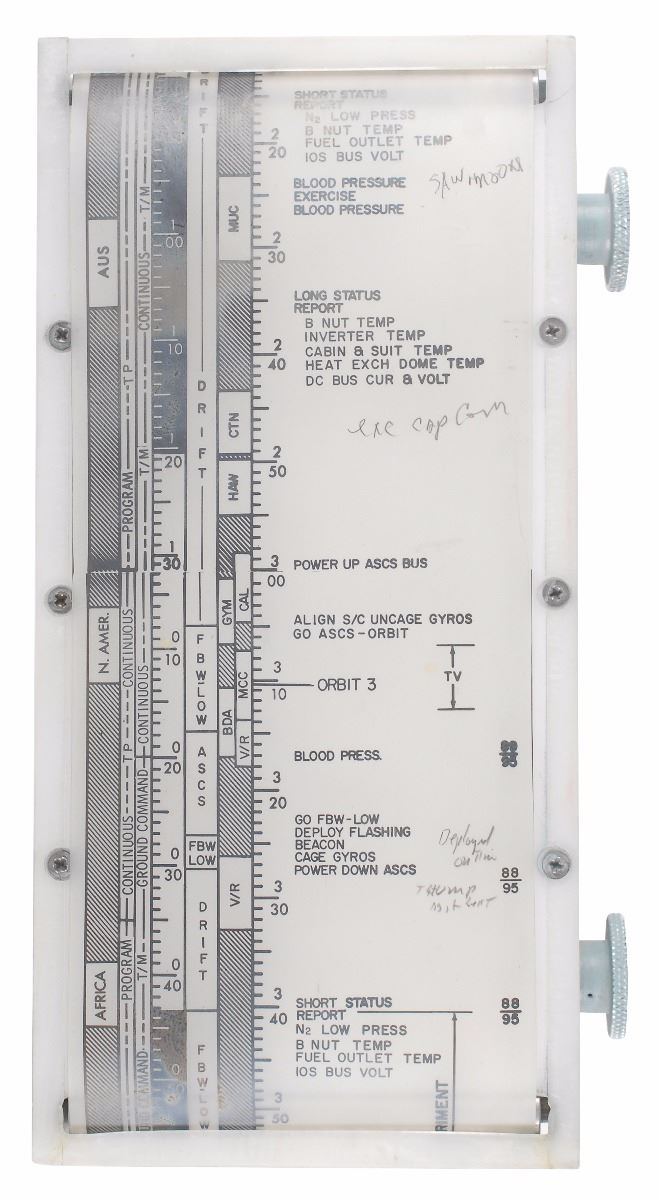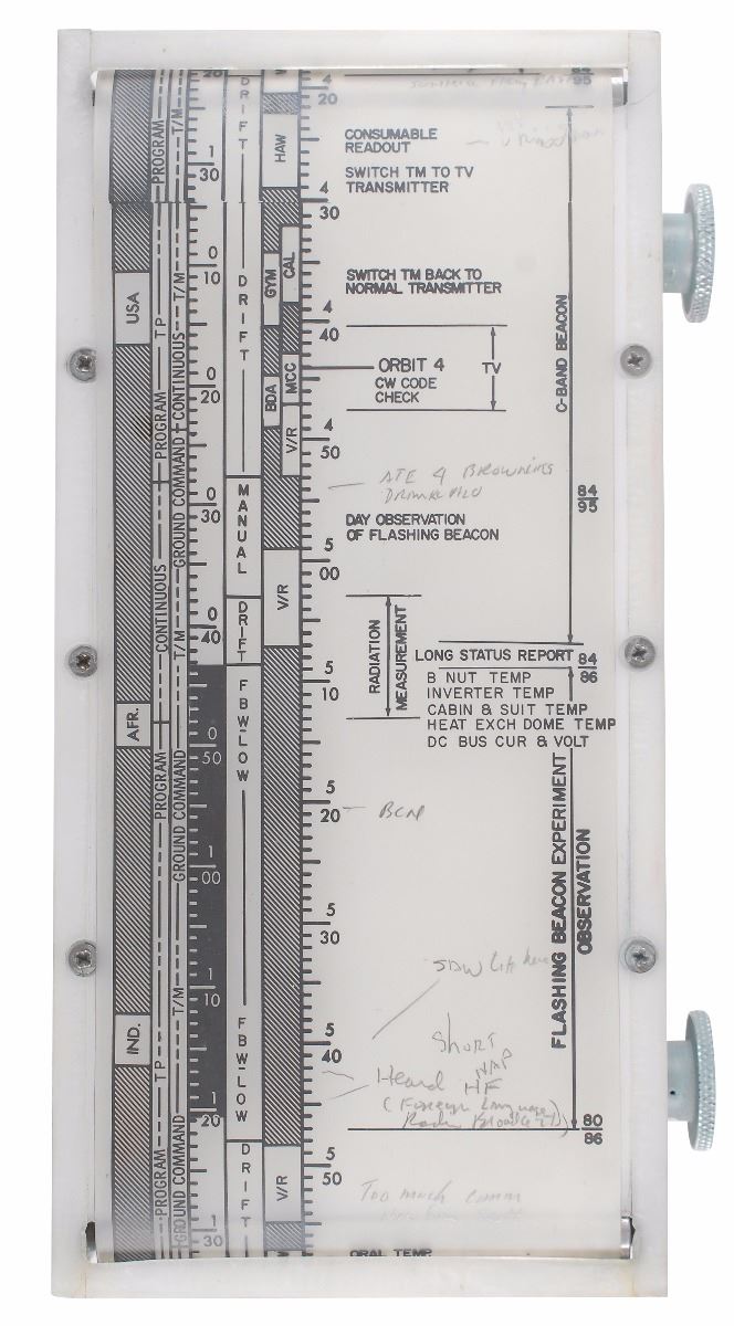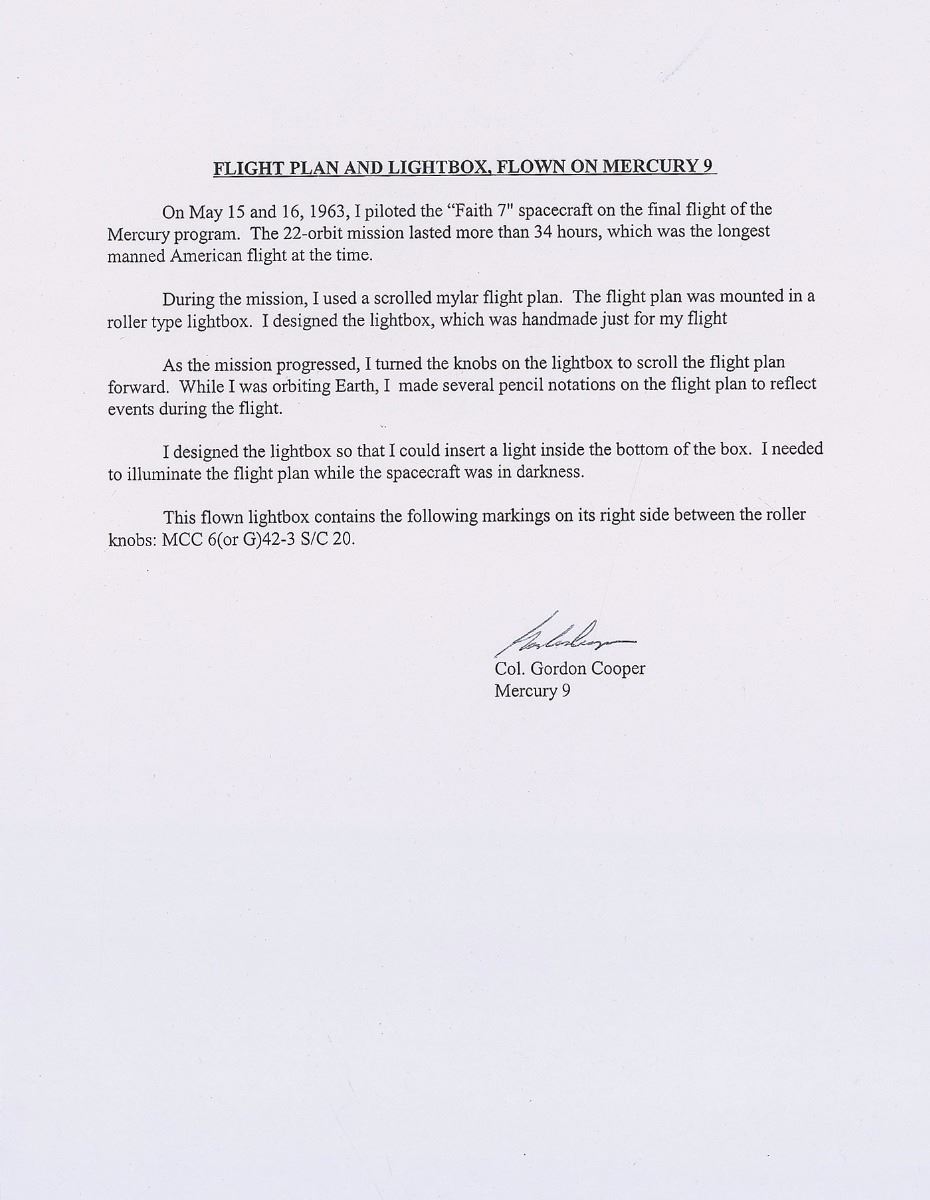 Flown flight plan and roller used by Gordon Cooper on Mercury 9, consisting of a translucent flight plan threaded through two spools contained within a metal 4 x 8.5 x 2.5 assembly, labeled on one side, “MCC 642-3, S/C-20.” The assembly has an open frame for backlighting and two knobs for rolling the long flight plan through the viewable area as the flight progressed. The plan bears Cooper’s in-flight handwritten pencil notations throughout, including: “Saw fireflies,” “Sunrise facing east,” “Remember yaw rate,” “Too much comm here from Scott,” “Short nap,” “Heard HF (Foreign language radio broadcast),” “Ate 4 brownies, drank H2O,” “To sleep here,” “Woke up here,” “Urine sample in space.” At Orbit 18, “GMT clock 10 sec fast.” In fine condition. Accompanied by a signed letter of provenance from Cooper, in part: “On May 15 and 16, 1963, I piloted the ‘Faith 7’ spacecraft on the final flight of the Mercury program. The 22-orbit mission lasted more than 34 hours, which was the longest manned American flight at the time. During that mission, I used a scrolled mylar flight plan. The flight plan was mounted in a roller type lightbox. I designed the lightbox, which was handmade just for my flight. As the mission progressed, I turned the knobs on the lightbox to scroll the flight plan forward. While I was orbiting Earth, I made several pencil notations on the flight plan to reflect events during the flight. I designed the lightbox so that I could insert a light inside the bottom of the box. I needed to illuminate the flight plan while the spacecraft was in darkness. This flown lightbox contains the following markings on its right side between the roller knobs: MCC 6(orG)42-3 S/C 20.” Also includes three other flight plan rolls.