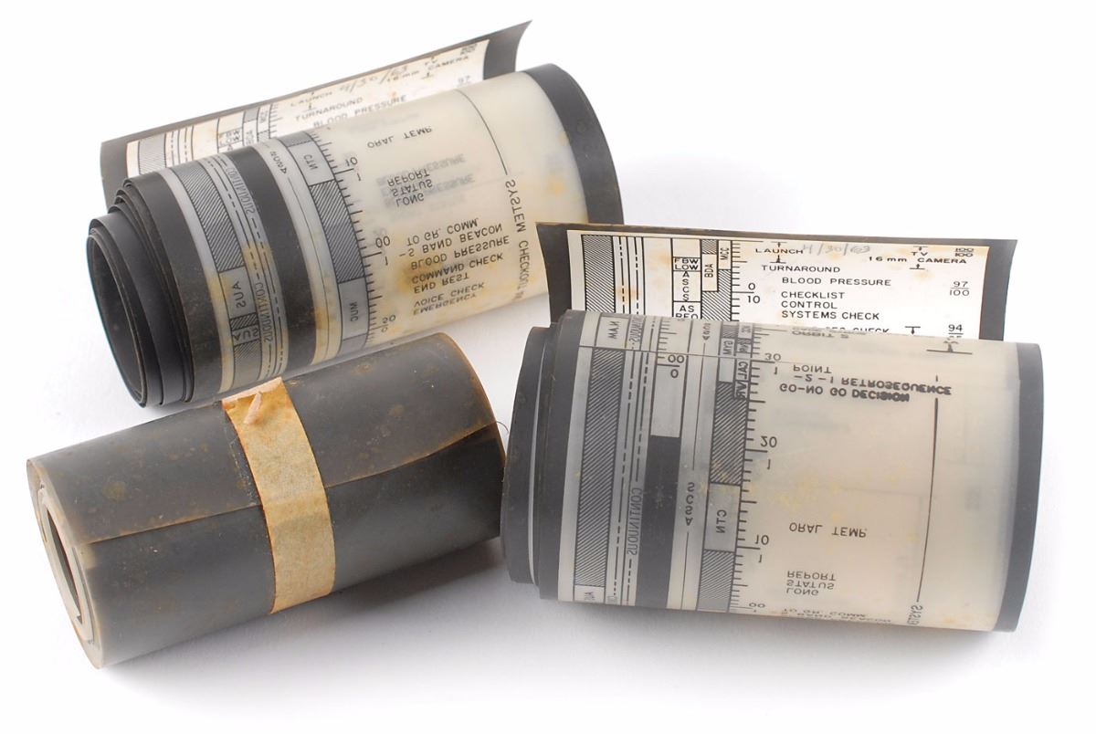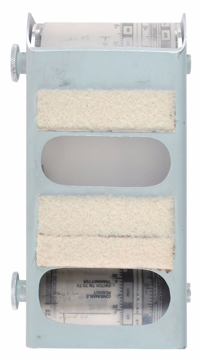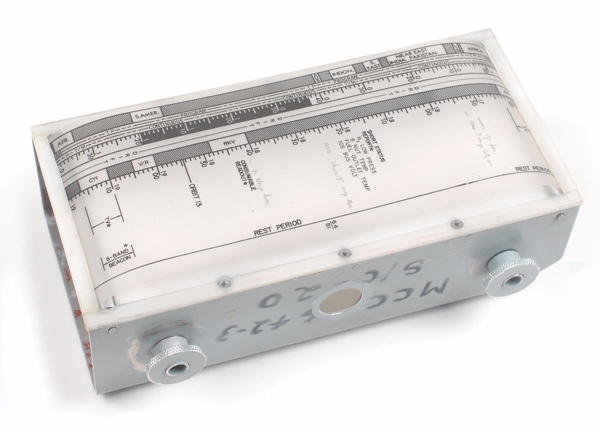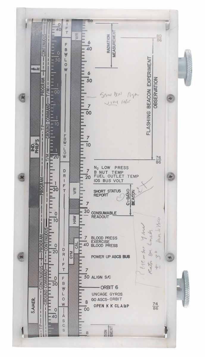 Flown flight plan and roller used by Gordon Cooper on Mercury 9, consisting of a translucent flight plan threaded through two spools contained within a metal 4 x 8.5 x 2.5 assembly, labeled on one side, “MCC 642-3, S/C-20.” The assembly has an open frame for backlighting and two knobs for rolling the long flight plan through the viewable area as the flight progressed. The plan bears Cooper’s in-flight handwritten pencil notations throughout, including: “Saw fireflies,” “Sunrise facing east,” “Remember yaw rate,” “Too much comm here from Scott,” “Short nap,” “Heard HF (Foreign language radio broadcast),” “Ate 4 brownies, drank H2O,” “To sleep here,” “Woke up here,” “Urine sample in space.” At Orbit 18, “GMT clock 10 sec fast.” In fine condition. Accompanied by a signed letter of provenance from Cooper, in part: “On May 15 and 16, 1963, I piloted the ‘Faith 7’ spacecraft on the final flight of the Mercury program. The 22-orbit mission lasted more than 34 hours, which was the longest manned American flight at the time. During that mission, I used a scrolled mylar flight plan. The flight plan was mounted in a roller type lightbox. I designed the lightbox, which was handmade just for my flight. As the mission progressed, I turned the knobs on the lightbox to scroll the flight plan forward. While I was orbiting Earth, I made several pencil notations on the flight plan to reflect events during the flight. I designed the lightbox so that I could insert a light inside the bottom of the box. I needed to illuminate the flight plan while the spacecraft was in darkness. This flown lightbox contains the following markings on its right side between the roller knobs: MCC 6(orG)42-3 S/C 20.” Also includes three other flight plan rolls.