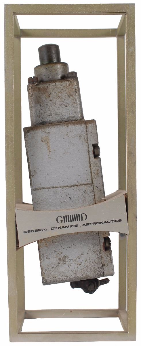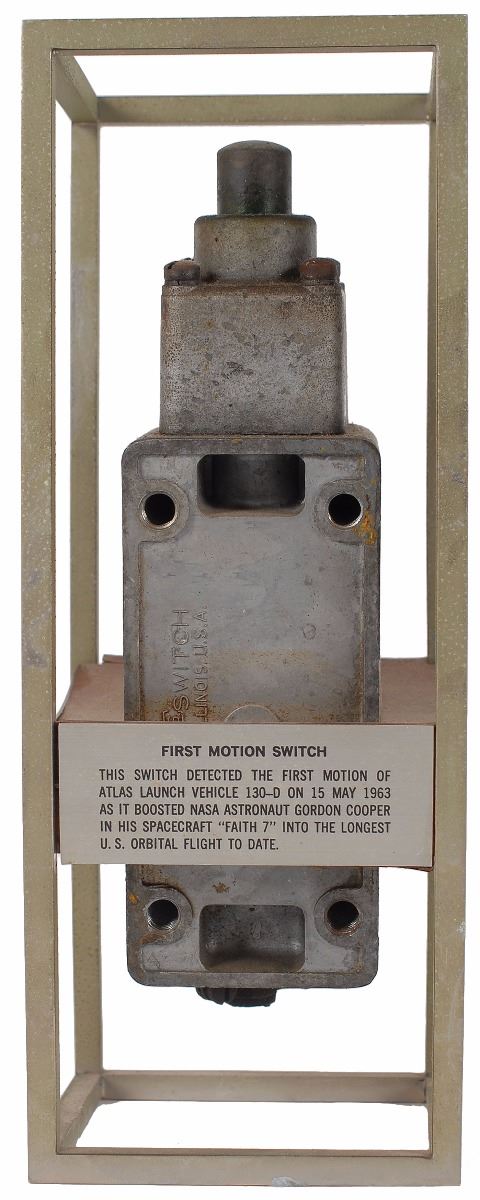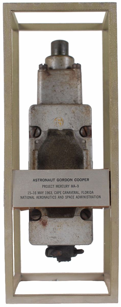 First motion switch used in the launch of Cooper’s Faith 7 capsule, mounted inside a 9.25 x 3.5 x 3.5 display, with a descriptive plaque on the side reading, “First Motion Switch. This switch detected the first motion of Atlas Launch Vehicle 130-D on 15 May 1963 as it boosted NASA astronaut Gordon Cooper in his spacecraft ‘Faith 7’ into the longest U.S. orbital flight to date.” The opposite side bears a plaque reading, “Astronaut Gordon Cooper, Project Mercury MA-9, 15–16 May 1963, Cape Canaveral, Florida, National Aeronautics and Space Administration.” Engraved plates on the other sides bear a Project Mercury emblem and General Dynamics logo. In fine condition. Accompanied by a letter of provenance from Gordon Cooper’s widow certifying it as originating from the Cooper Family Collection. Cooper’s successful flight made him the first American to spend more than 24 hours in space as well as the last-ever solo orbital mission. This switch, which detected the very moment his spacecraft launched, is a fantastic, well-presented memento from his personal collection.