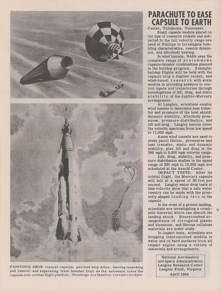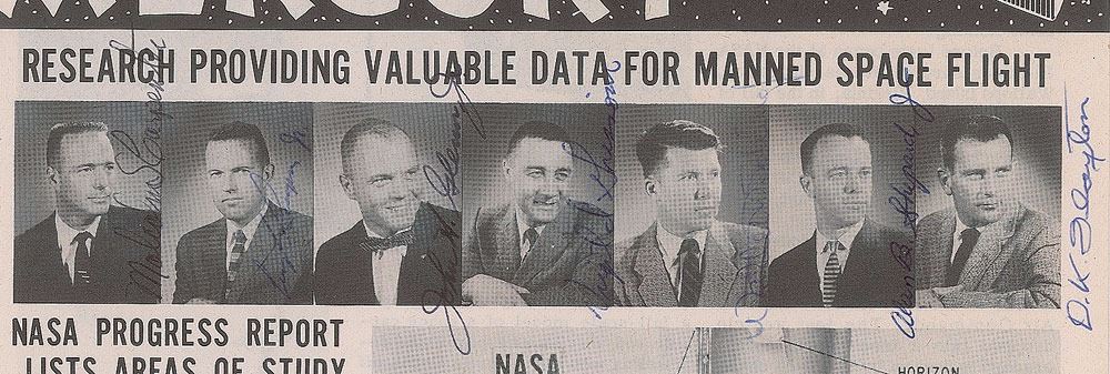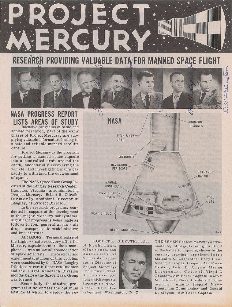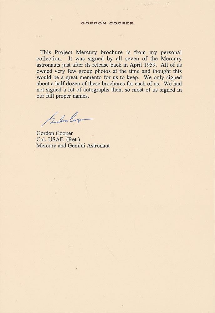 Gordon Cooper's personally owned Project Mercury brochure published at the NASA Langley Research Center in April 1959, four pages, 8 x 10.5, vertically signed on the first page to the right of their respective images in blue ballpoint by each member of the Mercury 7 crew: "Malcolm S. Carpenter," "Leroy G. Cooper, Jr.," "John H. Glenn, Jr.," "Virgil I. Grissom," "Walter M. Schirra, Jr.," "Alan B. Shepard, Jr.," and "D. K. Slayton." In fine condition. Accompanied by a signed letter of provenance from Cooper, in full: "This Project Mercury brochure is from my personal collection. It was signed by all seven of the Mercury astronauts just after its release back in April 1959. All of us owned very few group photos at the time and thought this would be a great memento for us to keep. We only signed about a half dozen of these brochures for each of us. We had not signed a lot of autographs then, so most of us signed in our proper full names." Signatures of all seven Mercury astronauts on a single item remains one of the more elusive prizes for serious space collectors; dated to just four months before the group's official selection, this fully signed vintage brochure is all the more impressive and desirable given its great visual appeal, outstanding condition, and steadfast provenance deriving from the pilot of the Faith 7 spacecraft.