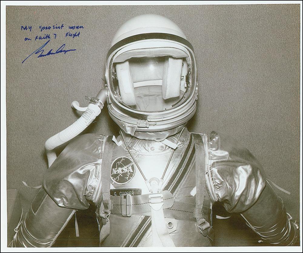 Glossy 10 x 8 photo of the NASA suit once worn by Gordon Cooper in Project Mercury, appropriately signed in blue felt tip “My spacesuit worn on Faith 7 flight, Gordon Cooper.” In fine condition.