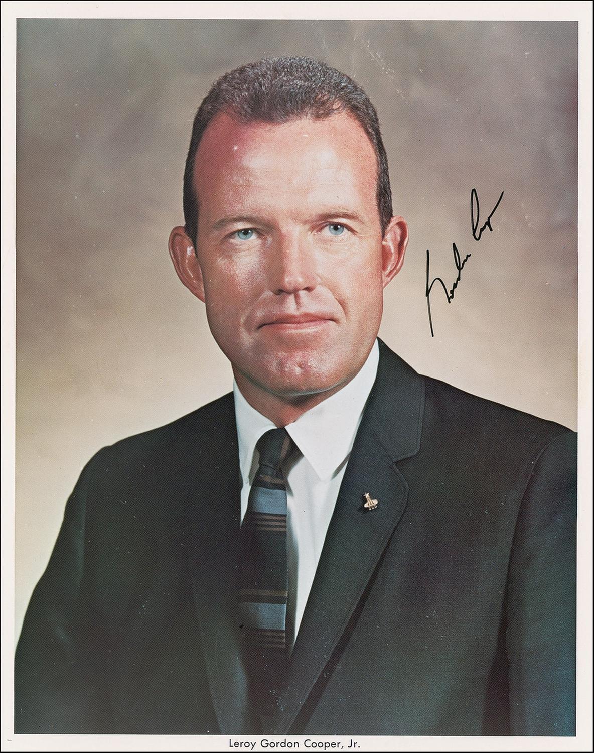 Color 8 x 10 NASA photo of Cooper in a jacket and tie, signed in black felt tip. In fine condition.