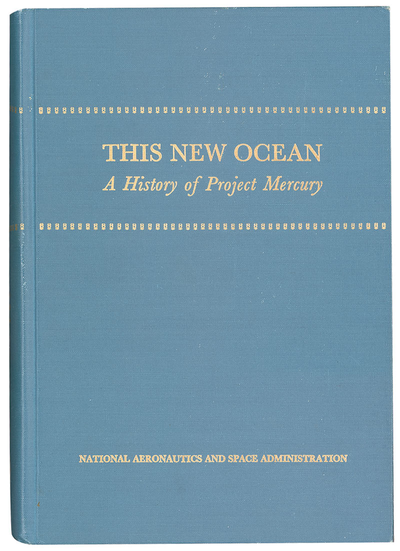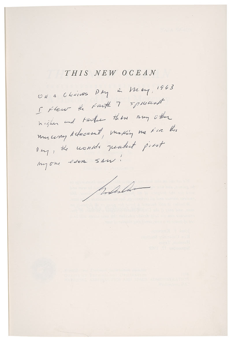 Signed book: This New Ocean: A History of Project Mercury. Washington, D. C.: US Government Printing Office, 1966. Hardcover, 7 x 10, 681 pages. Signed on the half-title page, “On a glorious day in May 1963, I flew the Faith 7 spacecraft higher and farther than any other Mercury astronaut, making me for the day, the world’s greatest pilot anyone ever saw! Gordon Cooper.” In fine condition, with some scattered light surface wear to covers and some light creasing to head and tail of spine.