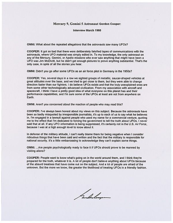 Souvenir typescript, one page, 8.5 x 11, of a 1980 interview given by Cooper to Omni magazine. In part: “Omni: What about the repeated allegations that the astronauts saw many UFOs?" Cooper: "It got so bad that there were deliberately falsified tapes of communications with the astronauts, where UFO material was simply edited in…Omni: Didn't you go after some UFOs as an air force pilot in Germany in the 1950s? Cooper: Yes, several days in a row we sighted groups of metallic, saucer-shaped vehicles at great altitudes over the base, and we tried to get close to them…I do believe UFOs exists and that the truly unexplained ones are from some other technologically advanced civilization…I'm sure some of the UFOs at least are not from anywhere on Earth." Signed at the bottom in black ink by Cooper. In fine condition, with horizontal mailing folds.