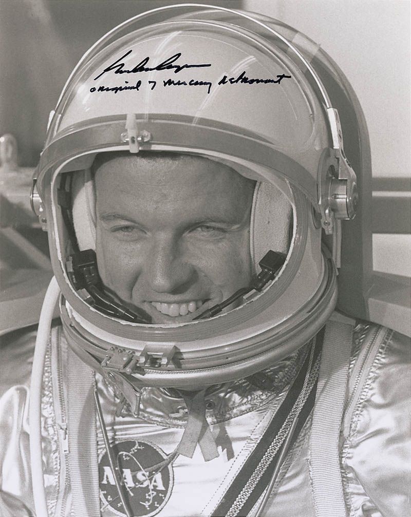 Glossy 8 x 10 head-and-shoulders photo of Cooper in his Mercury space suit, signed in black felt tip, “Gordon Cooper, Original 7 Mercury astronaut.” In very fine condition.
