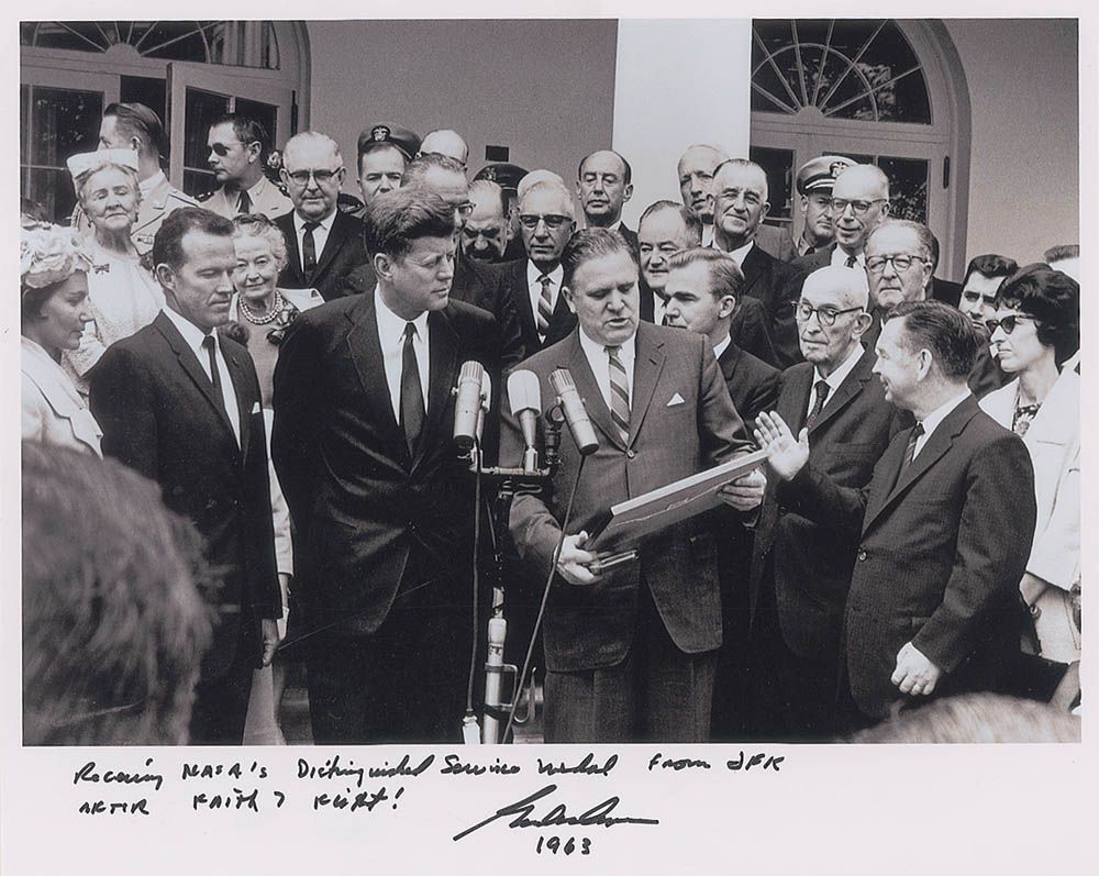 Color satin-finish 10 x 8 photo of Cooper receiving the Distinguished Service medal from John F. Kennedy, signed in black felt tip, “Receiving NASA’s Distinguished Service medal from JFK after Faith 7 flight! Gordon Cooper 1963,” the date photo was originally taken. In very fine condition.