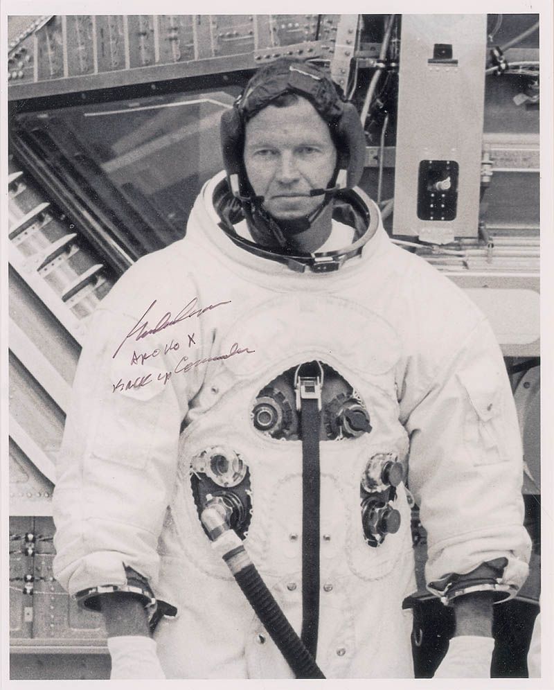 Satin-finish 8 x 10 photo of Cooper in his Apollo space suit, signed in black felt tip, “Gordon Cooper, Apollo X Back Up Commander.” In fine condition, with signature just a shade light. Any photo of Cooper in his Apollo space suit is quite uncommon.