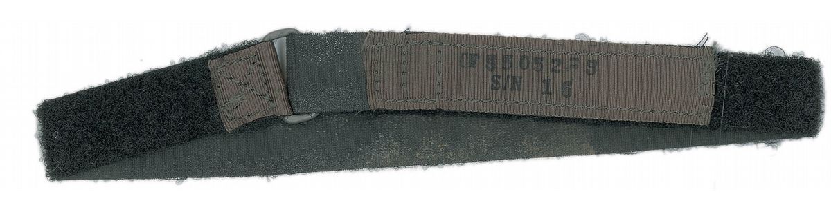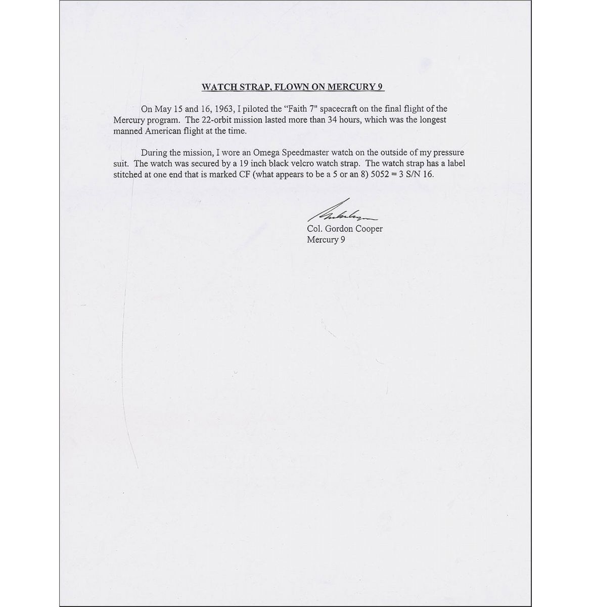 Flown 19? Velcro watch strap, S/N 16, worn on the wrist of Cooper’s pressure suit during his Faith 7 flight, which originally held an Omega Speedmaster watch. Accompanied by a letter of authenticity from Cooper which states “On May 15 and 16, 1963, I piloted the ‘Faith 7’ spacecraft…the longest manned flight at the time. During the mission, I wore an Omega Speedmaster watch on the outside of my pressure suit. The watch was secured by a 19-inch black velcro watch strap. The watch strap has a label stitched at one end that is marked CF (what appears to be a 5 or an 8) 5052=3 S/N 16.” In fine condition, with some scattered light soiling.