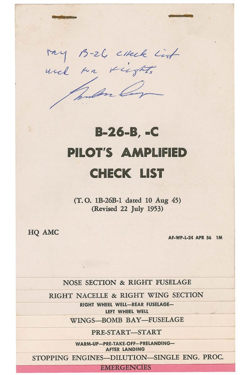 Cooper’s B-26-B,-C Pilot’s Amplified Check List, 4.5 x 7.5, bound by two staples at the top and dated “(Revised 22 July 1953).” A nine card check list including preflight inspection, warm-up, flight, emergencies, and post flight activities for the B-26 aircraft. Signed on the front cover in blue ballpoint, “My B-26 check list used for flights. Gordon Cooper.” In fine condition, with some scattered light toning and soiling, and expected handling wear.