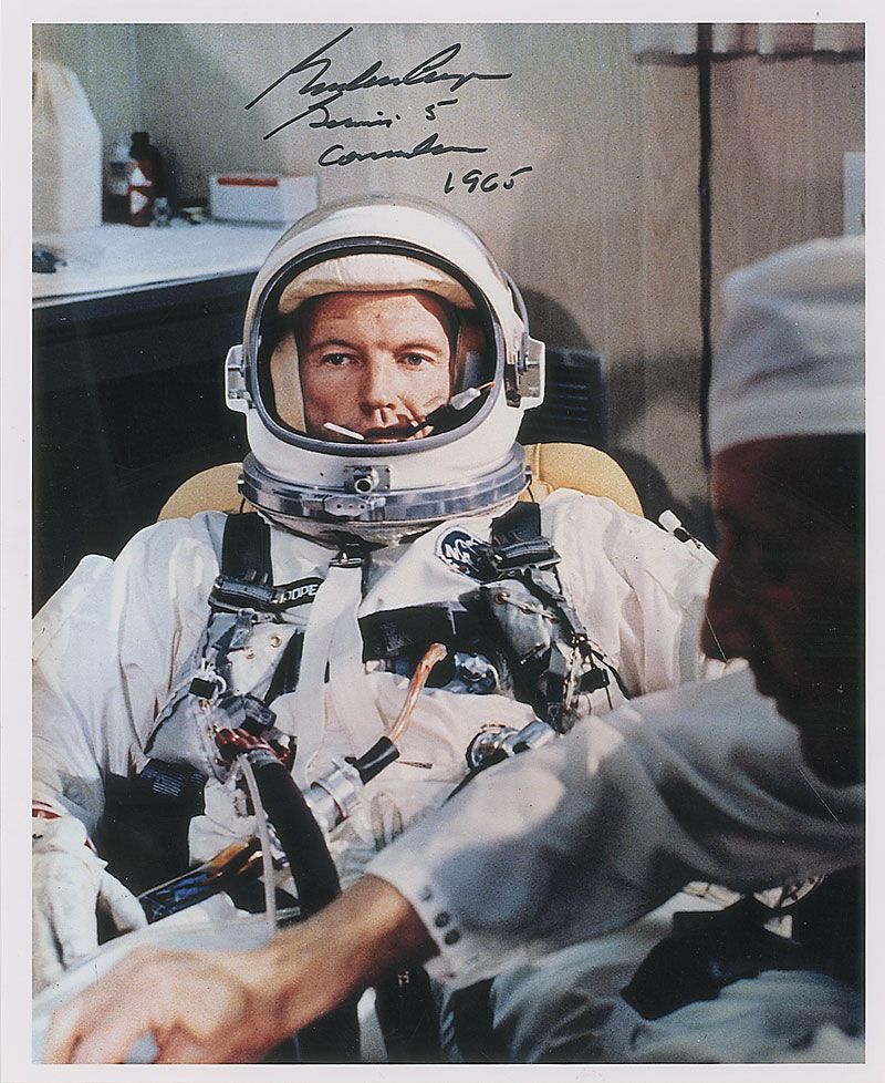Color satin-finish 8 x 10 photo of Cooper in his space suit, signed in black felt tip, “Gordon Cooper, Gemini 5 Commander, 1965.” In very fine condition.