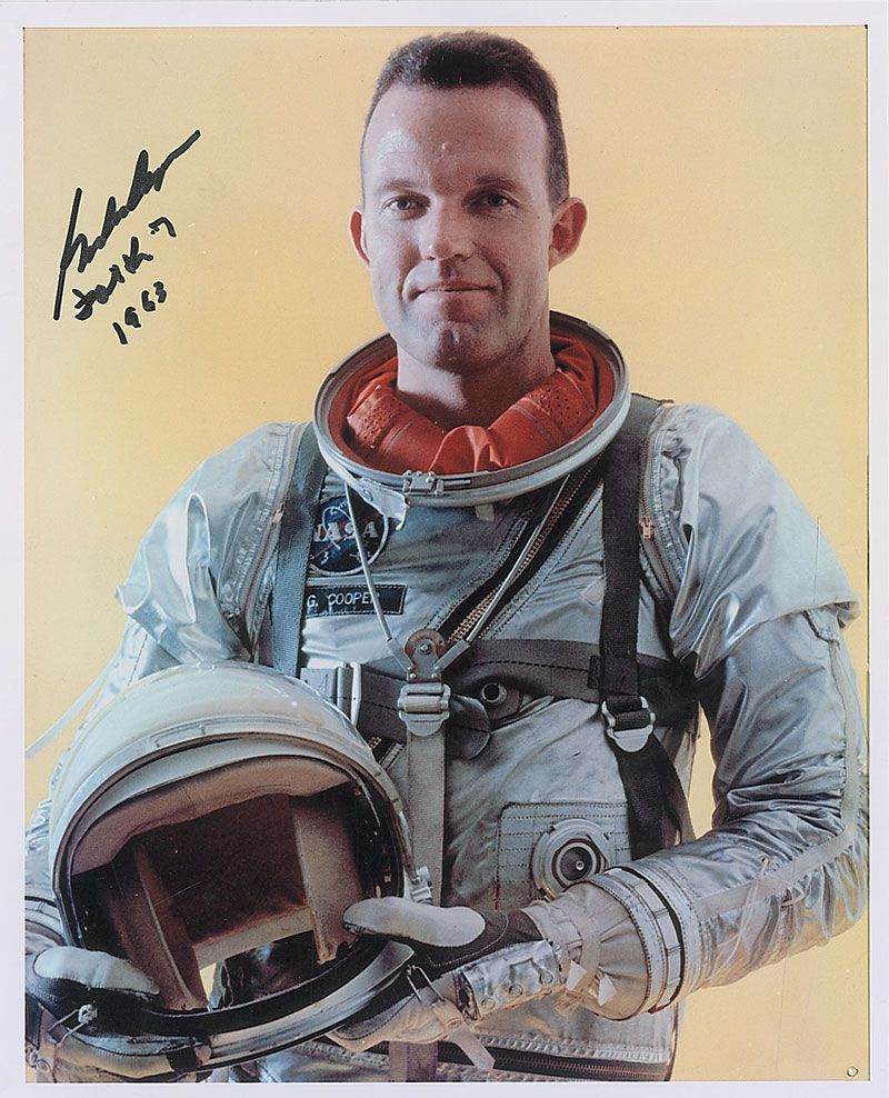 Color satin-finish 8 x 10 photo of Cooper in his Mercury spacesuit, signed in black felt tip, “Gordon Cooper, Faith 7, 1963.” In fine condition.