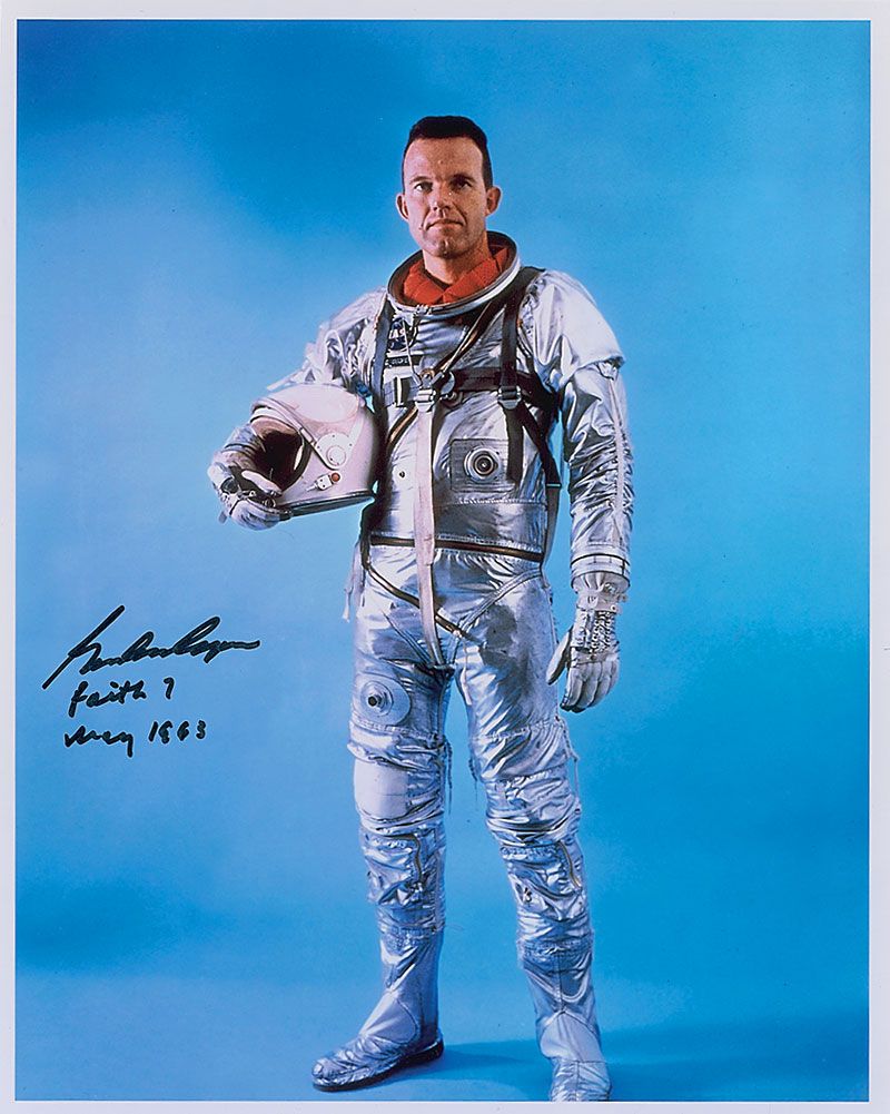 Color satin-finish 8 x 10 full-length photo of Cooper in his Mercury flight suit, signed in black felt tip, “Gordon Cooper, Faith 7, May 1963.” In very fine condition.