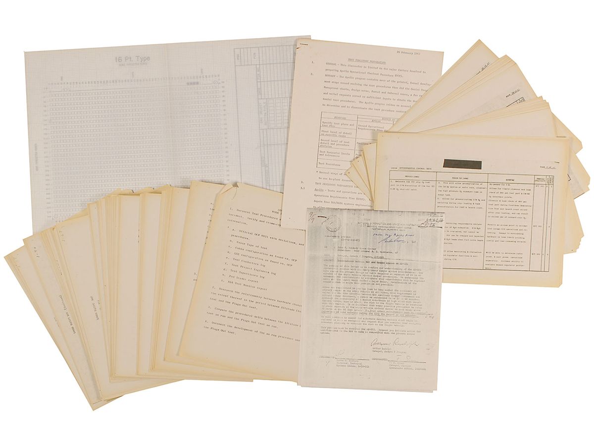 Cooper's Post Apollo 1 Fire File. File includes a four-page Test Procedure Preparation guideline; a 95+ page Work Statement and Proceedings for members of Investigation Panel Number 7 with a list of spacecraft 012 control panel switch positions as found after the fire and general outline of panel switches; a 47-page spacecraft equipment change proposal for modifications to the Block II, CSM spacecraft 101; and a 1967 US Government memoranda, signed in blue ballpoint, “From my Apollo files, Gordon Cooper.” In fine overall condition.