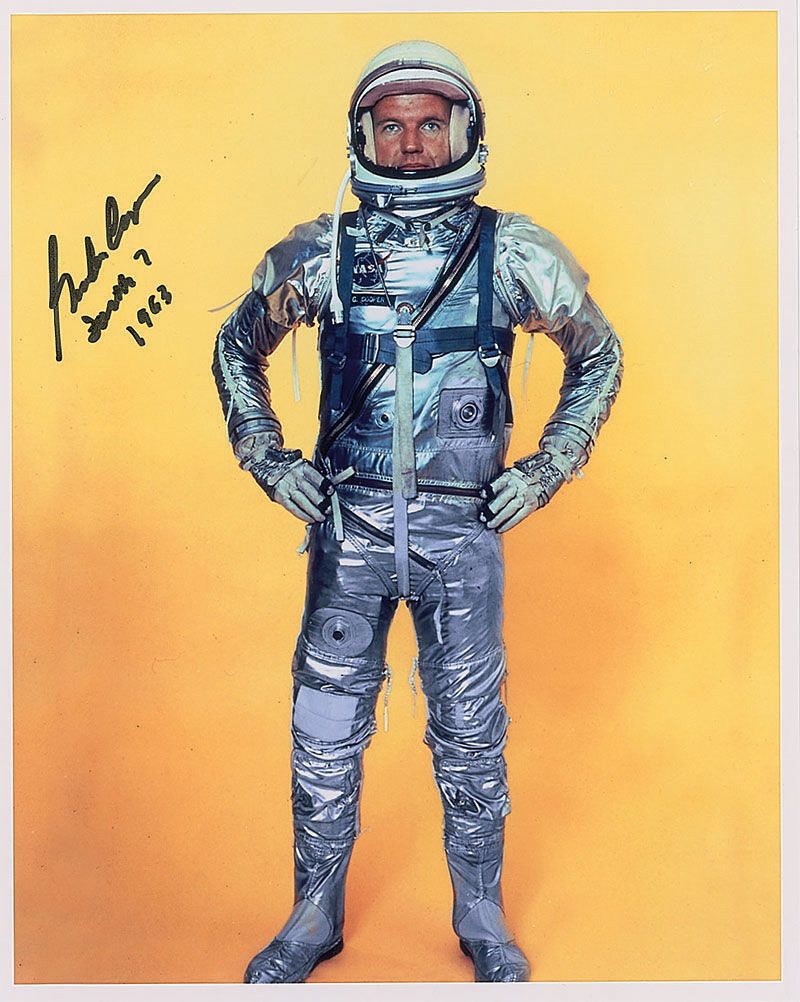 Color satin-finish 8 x 10 full-length photo of Cooper in his Mercury space suit, signed in black felt tip, “Gordon Cooper, Faith 7, 1963.” In very fine condition.