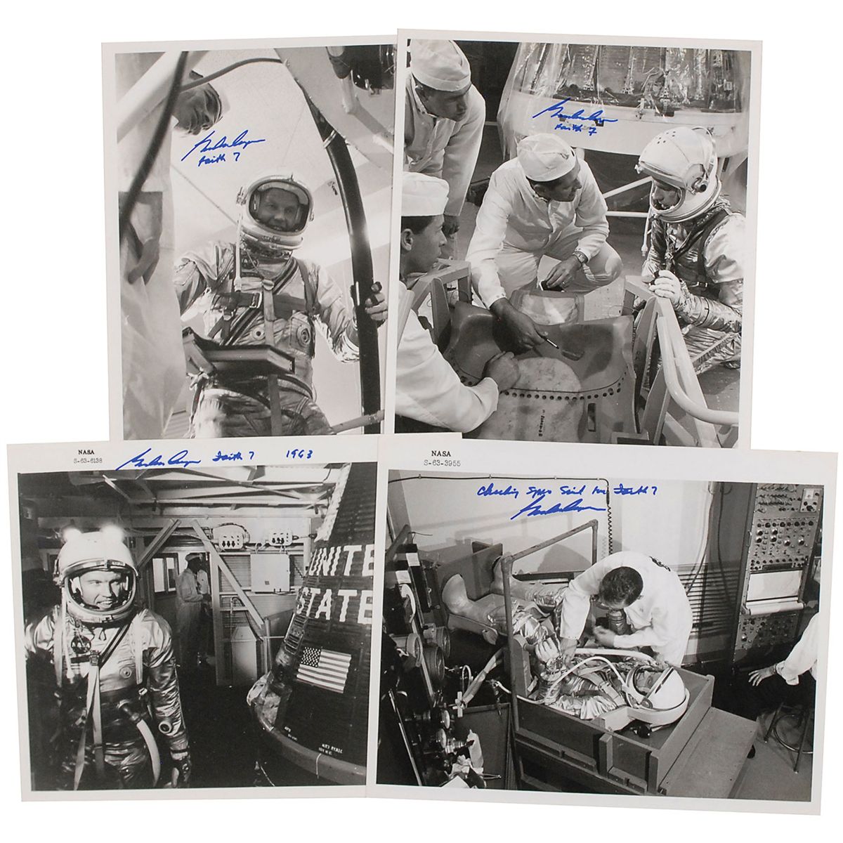Four glossy photos, two 8 x 10 and two 10 x 8, including two NASA photos, all of Cooper preparing for his Mercury flight, each signed in blue felt tip. In fine condition.