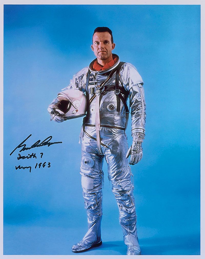 Color satin-finish 8 x 10 full-length photo of Cooper in his Mercury space suit, signed in black felt tip, “Gordon Cooper, Faith 7, May 1963.” In very fine condition.