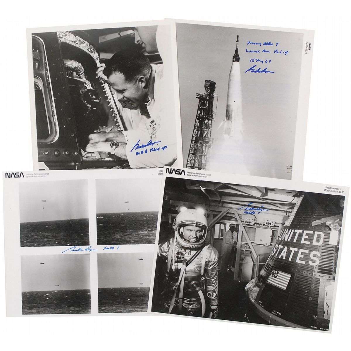 Four glossy photos, two 8 x 10 and two 10 x 8, including three vintage NASA photos, all signed later in blue felt tip. Photos are of Cooper inspecting the inside of his capsule, preparation for his launch, his liftoff, and his splash down. In fine condition, with a few scattered dings and a small tear to one vertical edge.
