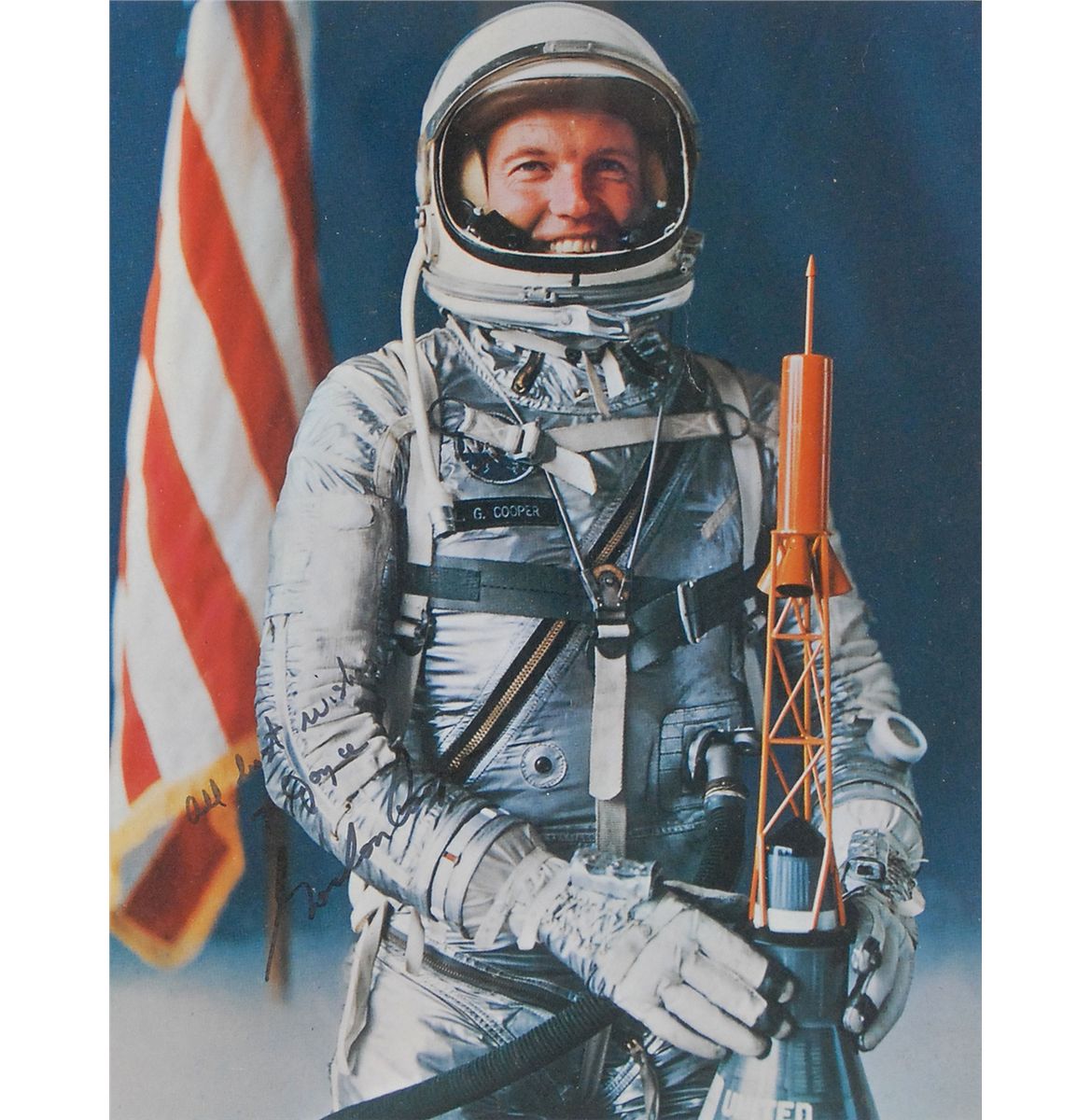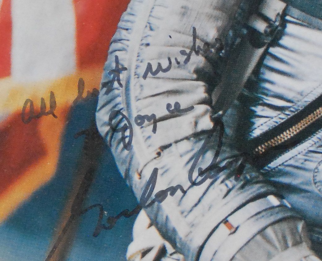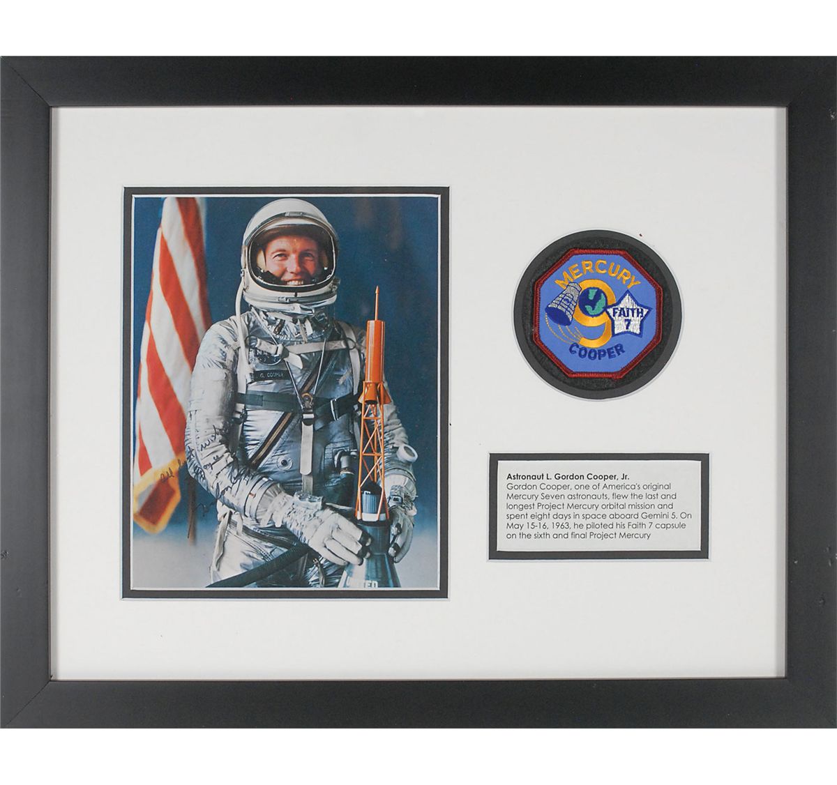 Color satin-finish 8 x 10 photo of Cooper posing in his Mercury flight suit, a model of his capsule in front of him, signed and inscribed in black felt tip, “All best wishes to Joyce, Gordon Cooper.” Double-matted and framed with a Mercury Faith 7 mission patch and a printed biography to an overall size of 20 x 16. Moderate contrast to signature and portion of inscription, otherwise fine condition. Inscribed to longtime NASA employee Joyce Abrams, who was a senior member of the ground support team.