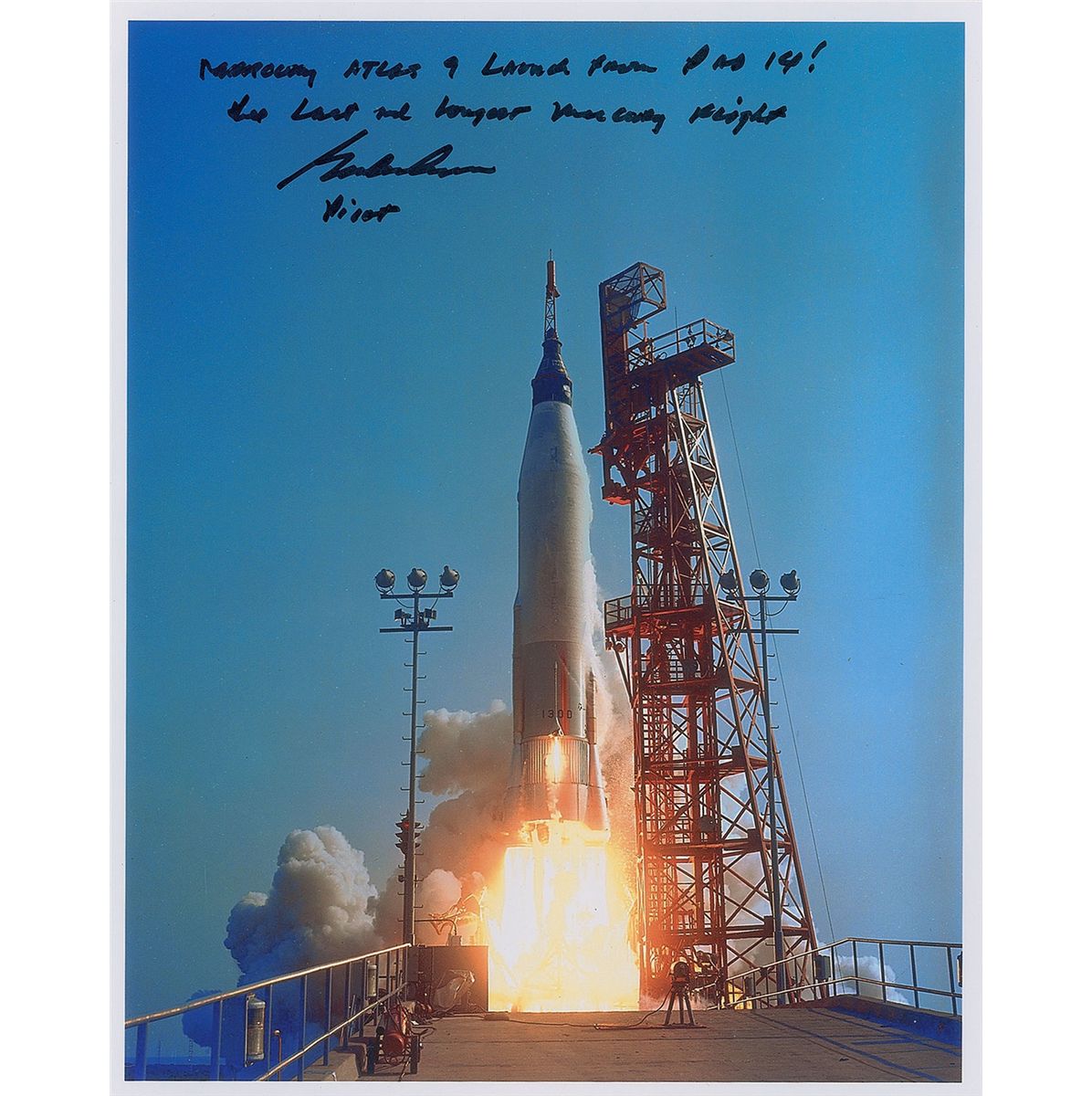 Color satin-finish 8 x 10 photo of the launch of Cooper’s Faith 7 flight, signed in black felt tip, “Mercury Atlas 9 launch from Pad 14! The last and longest Mercury flight, Gordon Cooper, Pilot.” In very fine condition.