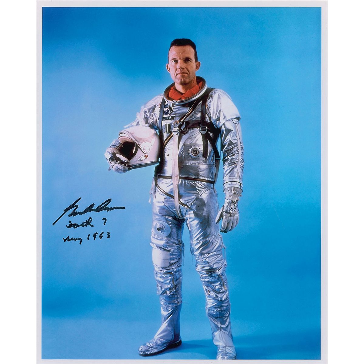 Color satin-finish 8 x 10 full-length photo of Cooper in his Mercury space suit, signed in black felt tip, “Gordon Cooper, Faith 7, May 1963.” In very fine condition.