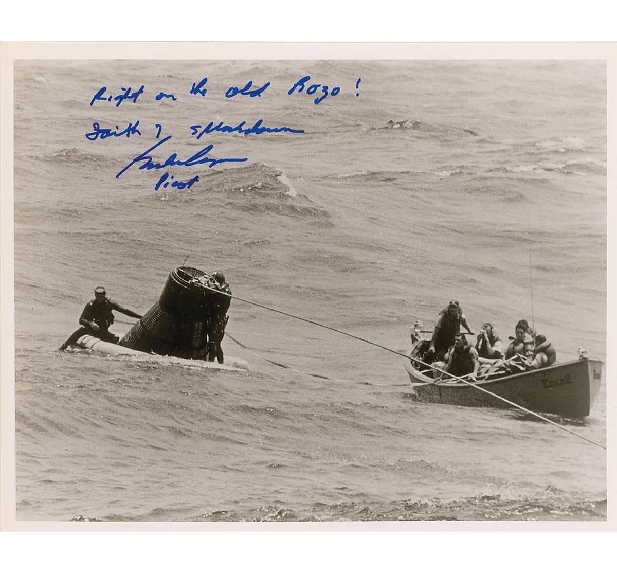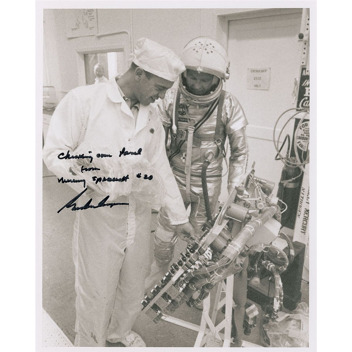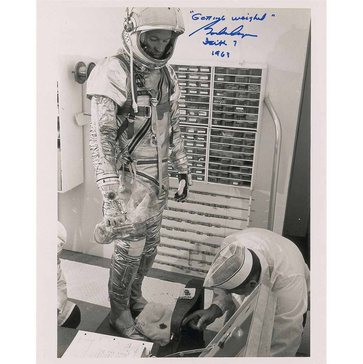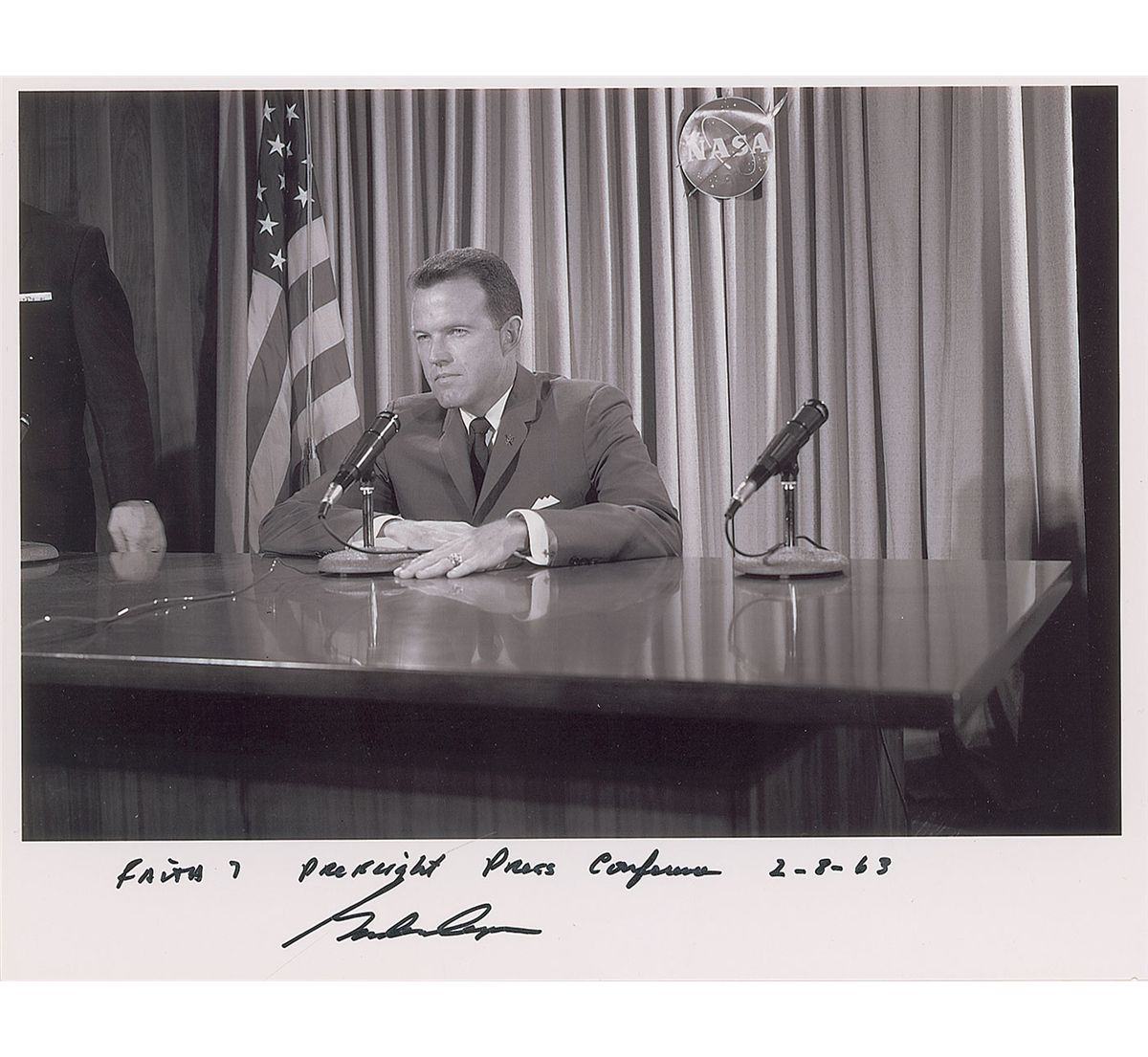 Four signed photos of Cooper before and after his Faith 7 mission, two 8 x 10 and two 10 x 8, various finishes, each signed in blue or black felt tip, with Cooper adding brief descriptions of the photos: “Checking out panel from Mercury spacecraft #20,” “Getting weighed,” “Right on the old Bozo!,” and “Faith 7 preflight press conference 2-8-63.” In fine condition.