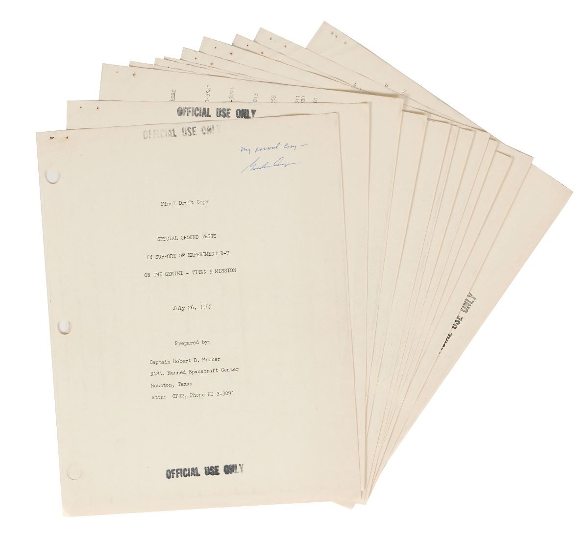 Cooper’s own personal final draft copy of a plan entitled “Special Ground Tests in Support of Experiment D-7 on the Gemini-Titan 5 Mission,” twelve pages, 8.5 x 11, July 26, 1965, signed on the first page in blue ballpoint, “My personal copy—Gordon Cooper.” All pages are stamped “Official Use Only.” The document was designed so that procedures related to “Experiment D-7, Space Object Radiometry” could be reviewed by all involved parties before finalization. In fine condition.