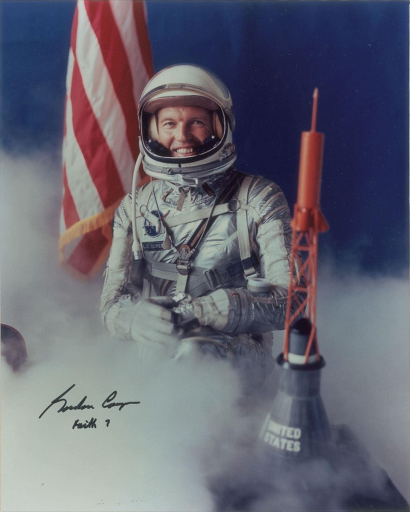 Fantastic color semi-glossy 8 x 10 photo of Cooper wearing his Mercury space suit next to a capsule model and surrounded by mist, signed in black felt tip, "Gordon Cooper, Faith 7." In fine condition.