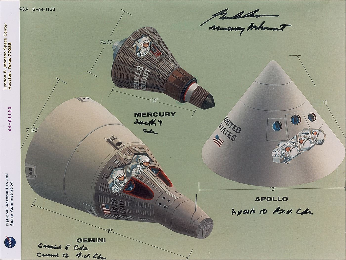 Color semi-glossy 10.5 x 8 photo showing artistic renderings of NASA's famed Mercury, Gemini, and Apollo capsules, signed in black felt tip, "Gordon Cooper, Mercury Astronaut," with Cooper adding below the respective capsules, "Faith 7 Cdr," "Apollo 10 B. U. Cdr," and "Gemini 5 Cdr., Gemini 12 B. U. Cdr." In fine condition.